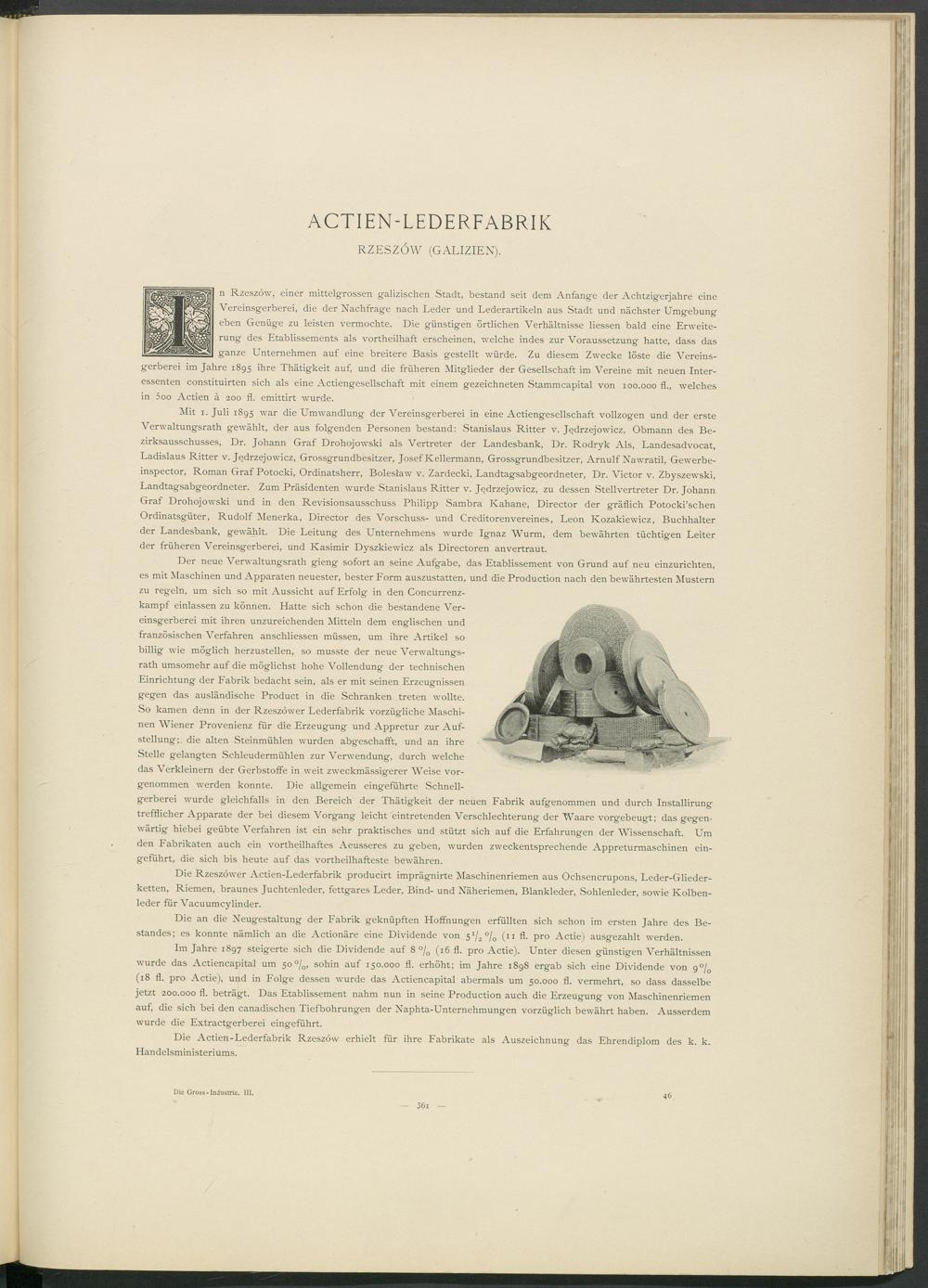 Mit 1. Juli 1895 war die Umwandlung der Vereinsgerberei in eine Actiengesellschaft vollzogen und der erste Verwaltungsrath gewählt, der aus folgenden Personen bestand: Stanislaus Ritter v. Jedrzejowicz, Obmann des Bezirksausschusses, Dr. Johann Graf Drohojowski als Vertreter der Landesbank, Dr. Rodryk Als, Landesadvocat, Ladislaus Ritter v. Jedrzejowicz, Grossgrundbesitzer, Josef Kellermann, Grossgrundbesitzer, Arnulf Nawratil, Gewerbeinspector, Roman Graf Potocki, Ordinatsherr, Boleslaw v. Zardecki, Landtagsabgeordneter, Dr. Victor v. Zbyszewski, Landtagsabgeordneter. Zum Präsidenten wurde Stanislaus Ritter v. Jedrzejowicz, zu dessen Stellvertreter Dr. Johann Graf Drohojowski und in den Revisionsausschuss Philipp Sambra Kahane, Director der gräflich Potocki’schen Ordinatsgüter, Rudolf Menerka, Director des Vorschuss- und Creditorenvereines, Leon Kozakiewicz, Buchhalter der Landesbank, gewäjilt. Die Leitung des Unternehmens wurde Ignaz Wurm, dem bewährten tüchtigen Leiter der früheren Vereinsgerberei, und Kasimir Dyszkiewicz als Directoren anvertraut.
