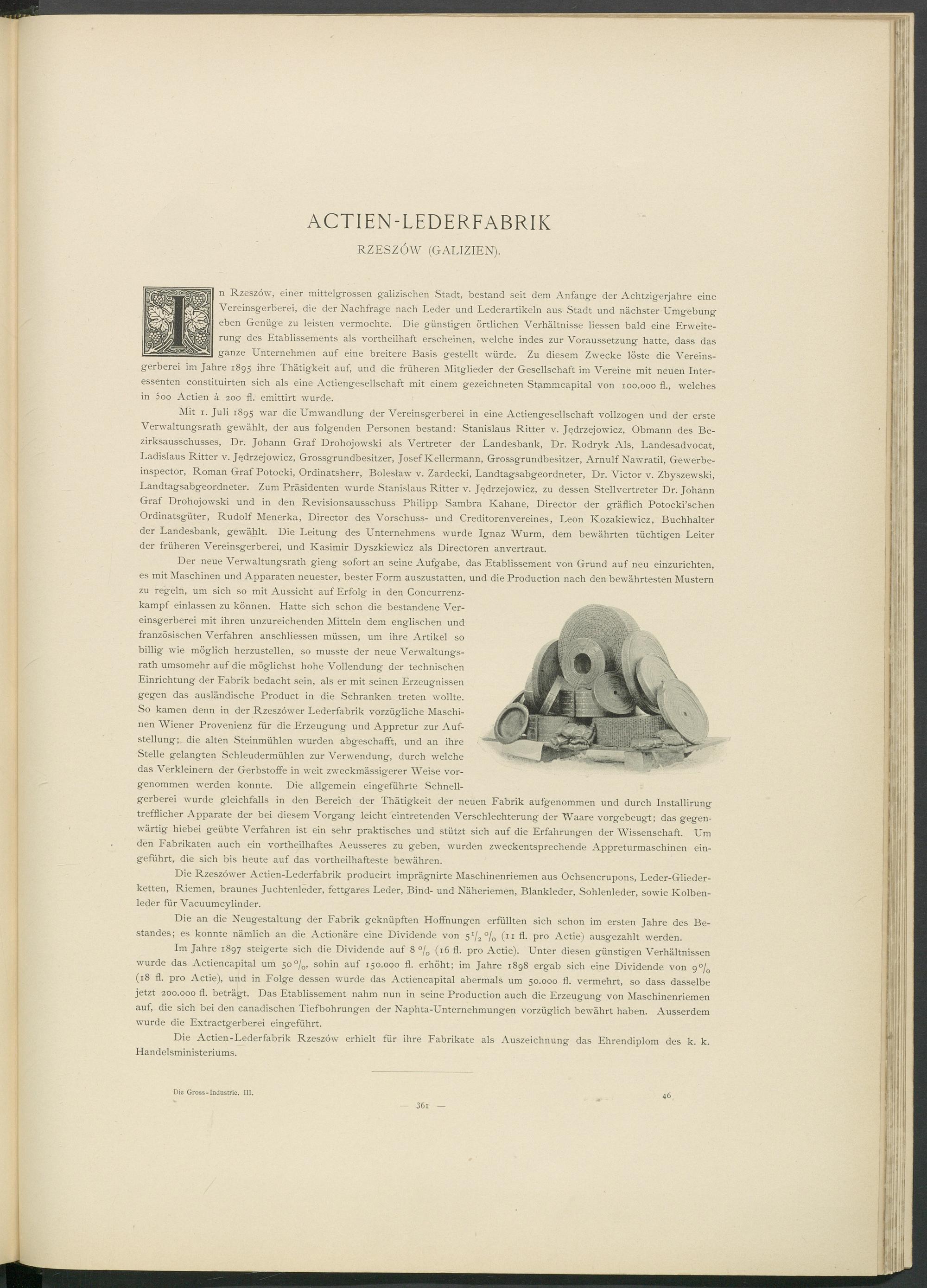 n Rzeszöw, einer mittelgrossen galizischen Stadt, bestand seit dem Anfänge der Achtzigerjahre eine Vereinsgerberei, die der Nachfrage nach Leder und Lederartikeln aus Stadt und nächster Umgebung eben Genüge zu leisten vermochte. Die günstigen örtlichen Verhältnisse Hessen bald eine Erweiterung des Etablissements als vortheilhaft erscheinen, welche indes zur Voraussetzung hatte, dass das ganze Unternehmen auf eine breitere Basis gestellt würde. Zu diesem Zwecke löste die Vereinsgerberei im Jahre 1895 ihre Thätigkeit auf, und die früheren Mitglieder der Gesellschaft im Vereine mit neuen Interessenten constituirten sich als eine Actiengesellschaft mit einem gezeichneten Stammcapital von 100.000 fl., welches in 5 00 Actien ä 200 fl. emittirt wurde.