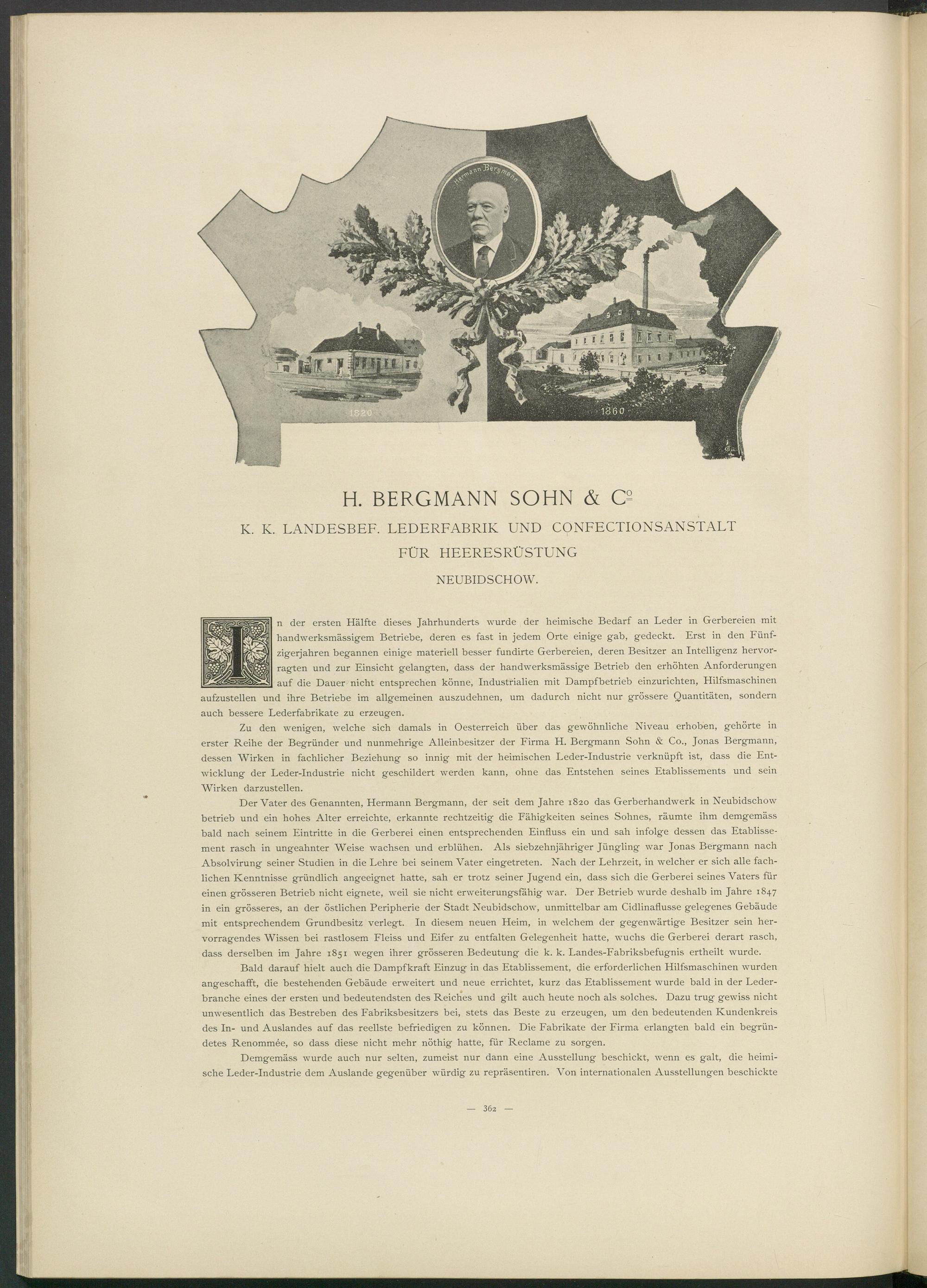 Zu den wenigen, welche sich damals in Oesterreich über das gewöhnliche Niveau erhoben, gehörte in erster Reihe der Begründer und nunmehrige Alleinbesitzer der Firma H. Bergmann Sohn & Co., Jonas Bergmann, dessen Wirken in fachlicher Beziehung so innig mit der heimischen Leder-Industrie verknüpft ist, dass die Entwicklung der Leder-Industrie nicht geschildert werden kann, ohne das Entstehen seines Etablissements und sein Wirken darzustellen.