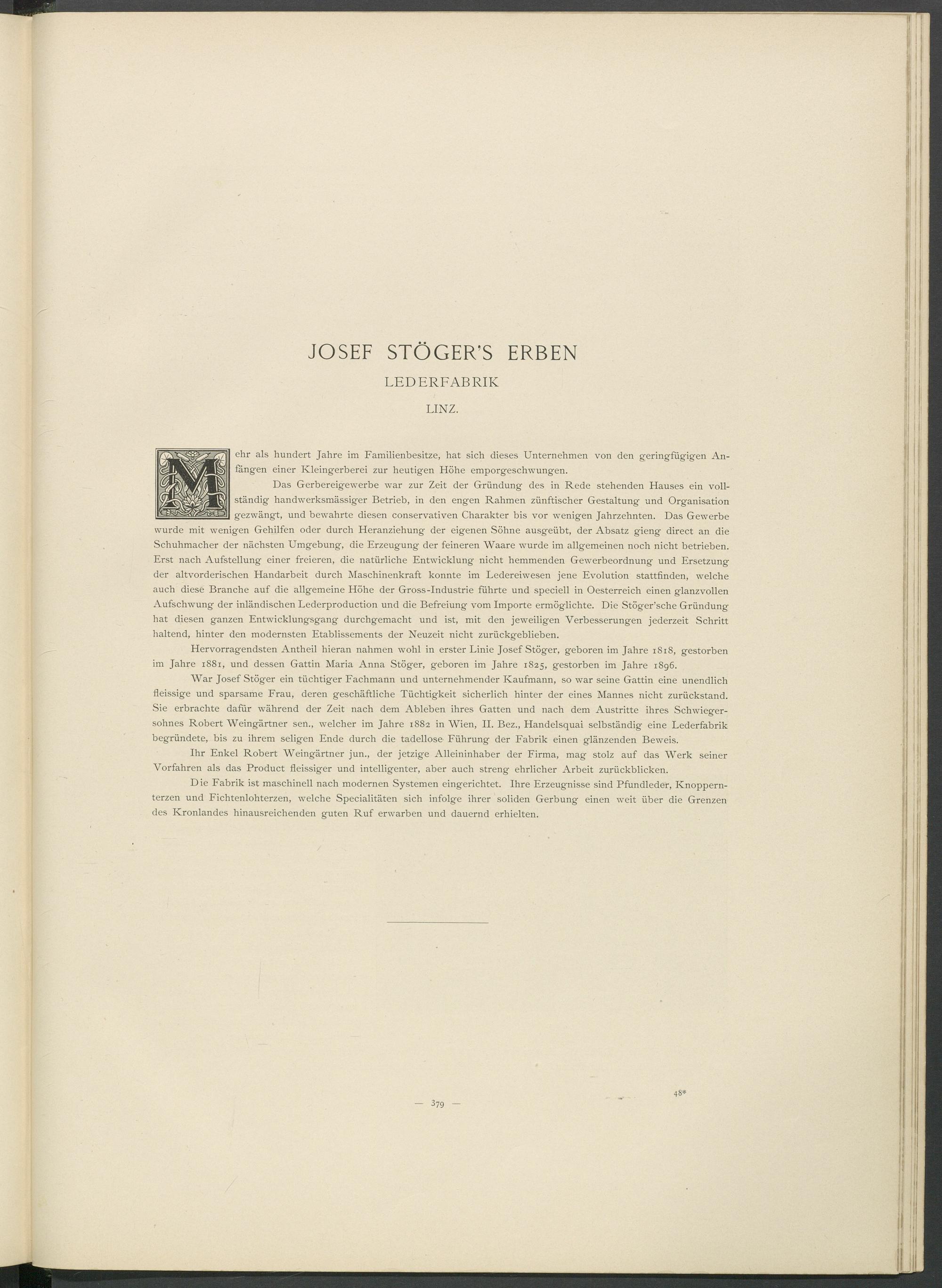 Das Gerbereigewerbe war zur Zeit der Gründung des in Rede stehenden Hauses ein vollständig handwerksmässiger Betrieb, in den engen Rahmen zünftischer Gestaltung und Organisation gezwängt, und bewahrte diesen conservativen Charakter bis vor wenigen Jahrzehnten. Das Gewerbe wurde mit wenigen Gehilfen oder durch Heranziehung der eigenen Söhne ausgeübt, der Absatz gieng direct an die Schuhmacher der nächsten Umgebung, die Erzeugung der feineren Waare wurde im allgemeinen noch nicht betrieben. Erst nach Aufstellung einer freieren, die natürliche Entwicklung nicht hemmenden Gewerbeordnung und Ersetzung der altvorderischen Handarbeit durch Maschinenkraft konnte im Ledereiwesen jene Evolution stattfinden, welche auch diese Branche auf die allgemeine Höhe der Gross-Industrie führte und speciell in Oesterreich einen glanzvollen Aufschwung der inländischen Lederproduction und die Befreiung vom Importe ermöglichte. Die Stöger’sche Gründung hat diesen ganzen Entwicklungsgang durchgemacht und ist, mit den jeweiligen Verbesserungen jederzeit Schritt haltend, hinter den modernsten Etablissements der Neuzeit nicht zurückgeblieben.
