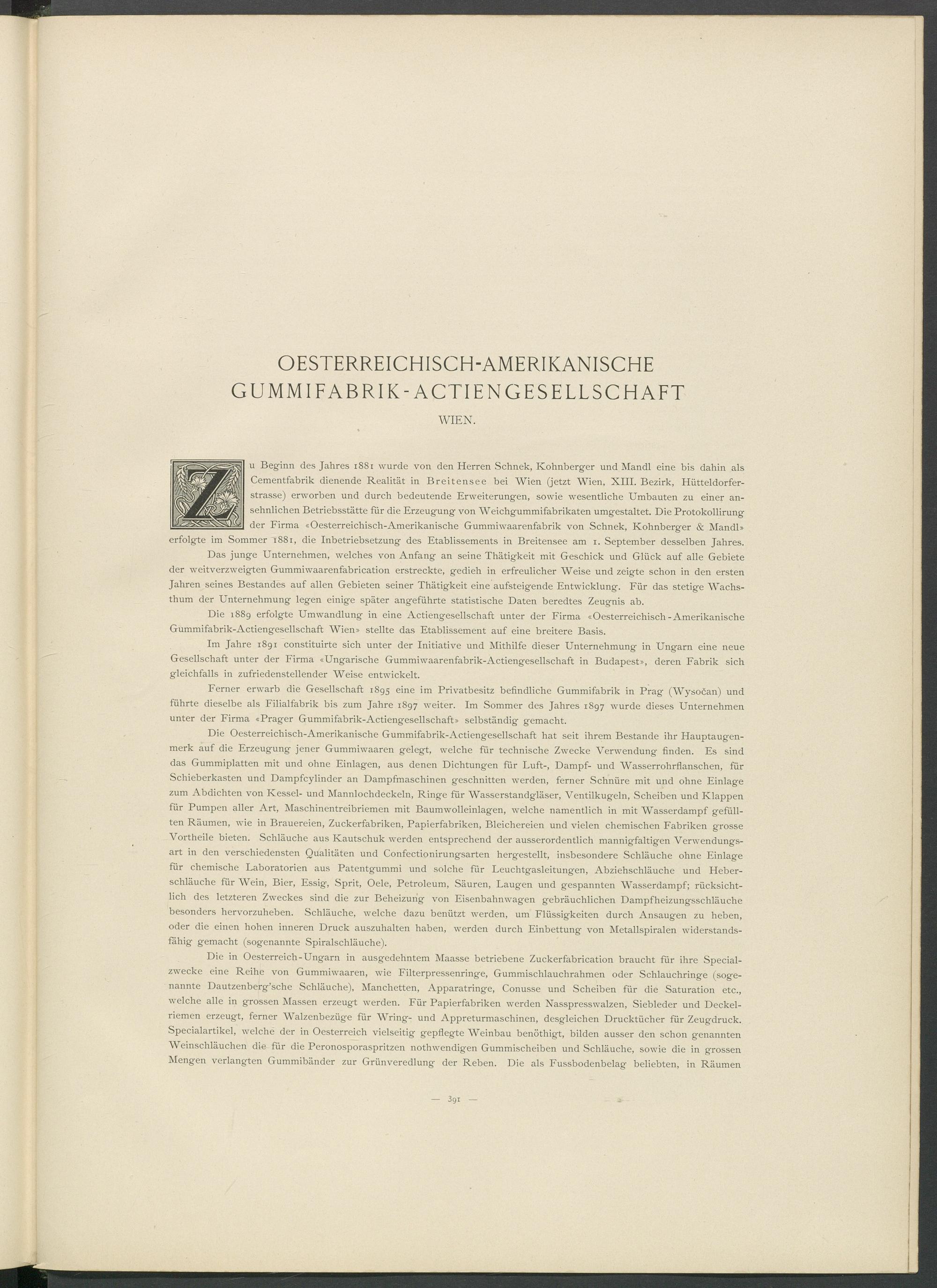u Beginn des Jahres 1881 wurde von den Herren Schnek, Kohnberger und Mandl eine bis dahin als Cementfabrik dienende Realität in Breitensee bei Wien (jetzt Wien, XIII. Bezirk, Hütteldorfer- strasse) erworben und durch bedeutende Erweiterungen, sowie wesentliche Umbauten zu einer ansehnlichen Betriebsstätte für die Erzeugung von Weichgummifabrikaten umgestaltet. Die Protokollirung der Firma «Oesterreichisch-Amerikanische Gummiwaarenfabrik von Schnek, Kohnberger & Mandl» erfolgte im Sommer T 881, die Inbetriebsetzung des Etablissements in Breitensee am i. September desselben Jahres.