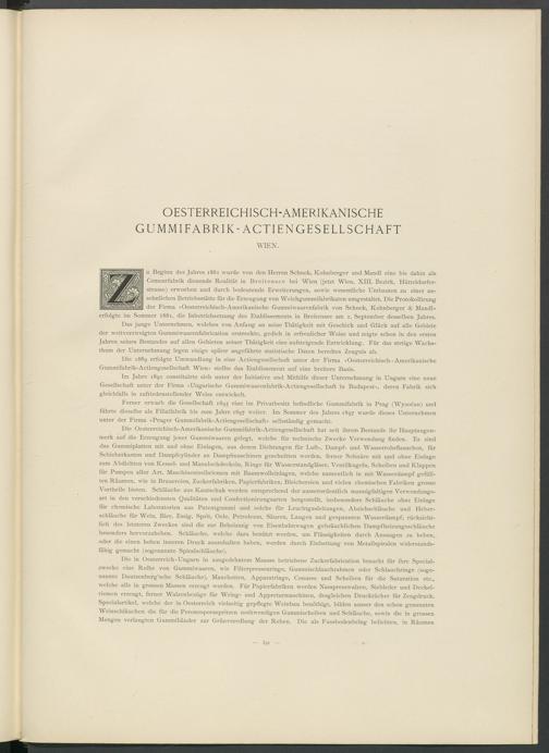 Die Oesterreichisch-Amerikanische Gummifabrik-Actiengesellschaft hat seit ihrem Bestände ihr Hauptaugenmerk auf die Erzeugung jener Gummiwaaren gelegt, welche für technische Zwecke Verwendung finden. Es sind das Gummiplatten mit und ohne Einlagen, aus denen Dichtungen für Luft-, Dampf- und Wasserrohrflanschen, für Schieberkasten und Dampfcylinder an Dampfmaschinen geschnitten werden, ferner Schnüre mit und ohne Einlage zum Abdichten von Kessel- und Mannlochdeckeln, Ringe für Wasserstandgläser, Ventilkugeln, Scheiben und Klappen für Pumpen aller Art, Maschinentreibriemen mit Baumwolleinlagen, welche namentlich in mit Wasserdampf gefüllten Räumen, wie in Brauereien, Zuckerfabriken, Papierfabriken, Bleichereien und vielen chemischen Fabriken grosse Vortheile bieten. Schläuche aus Kautschuk werden entsprechend der ausserordentlich mannigfaltigen Verwendungsart in den verschiedensten Qualitäten und Confectionirungsarten herg'estellt, insbesondere Schläuche ohne Einlage für chemische Laboratorien aus Patentgummi und solche für Leuchtgasleitungen, Abziehschläuche und Heberschläuche für Wein, Bier, Essig, Sprit, Oele, Petroleum, Säuren, Laugen und gespannten Wasserdampf; rücksichtlich des letzteren Zweckes sind die zur Beheizung von Eisenbahnwagen gebräuchlichen Dampfheizungsschläuche besonders hervorzuheben. Schläuche, welche dazu benützt werden, um Flüssigkeiten durch Ansaugen zu heben, oder die einen hohen inneren Druck auszuhalten haben, werden durch Einbettung von Metallspiralen widerstandsfähig gemacht (sogenannte Spiralschläuche).