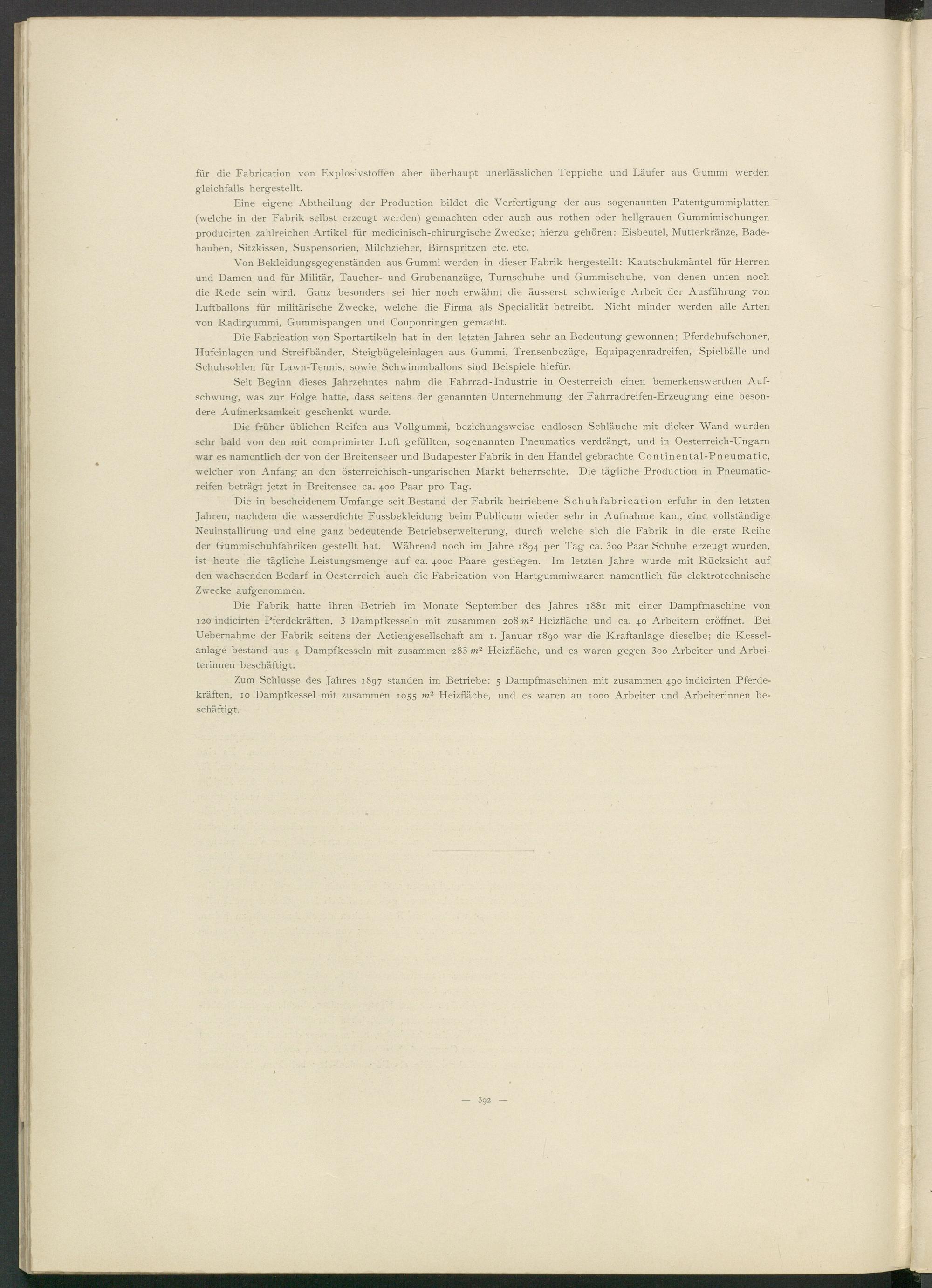 Die früher üblichen Reifen aus Vollgummi, beziehungsweise endlosen Schläuche mit dicker Wand wurden sehr bald von den mit comprimirter Luft gefüllten, sogenannten Pneumatics verdrängt, und in Oesterreich-Ungarn war es namentlich der von der Breitenseer und Budapester Fabrik in den Handel gebrachte Continental-Pneumatic, welcher von Anfang an den österreichisch-ungarischen Markt beherrschte. Die tägliche Production in Pneumatic- reifen beträgt jetzt in Breitensee ca. 400 Paar pro Tag.