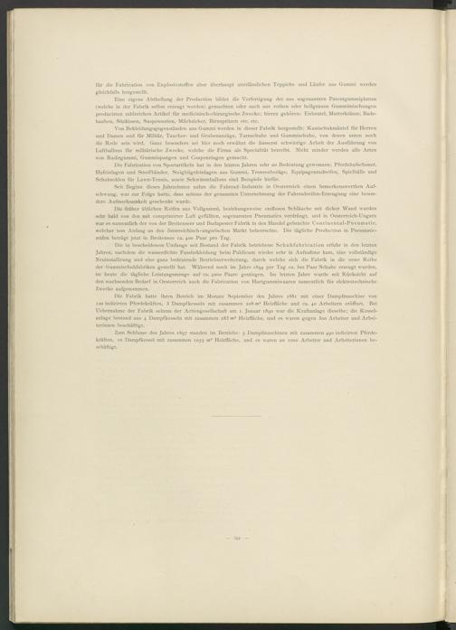 Die in bescheidenem Umfange seit Bestand der Fabrik betriebene Schuhfabrication erfuhr in den letzten Jahren, nachdem die wasserdichte Fussbekleidung beim Publicum wieder sehr in Aufnahme kam, eine vollständige Neuinstallirung und eine ganz bedeutende Betriebserweiterung, durch welche sich die Fabrik in die erste Reihe der Gummischuhfabriken gestellt hat. Während noch im Jahre 1894 per Tag ca. 3oo Paar Schuhe erzeugt wurden, ist heute die tägliche Leistungsmenge auf ca. 4000 Paare gestiegen. Im letzten Jahre wurde mit Rücksicht auf den wachsenden Bedarf in Oesterreich auch die Fabrication von Hartgummiwaaren namentlich für elektrotechnische Zwecke aufgenommen.