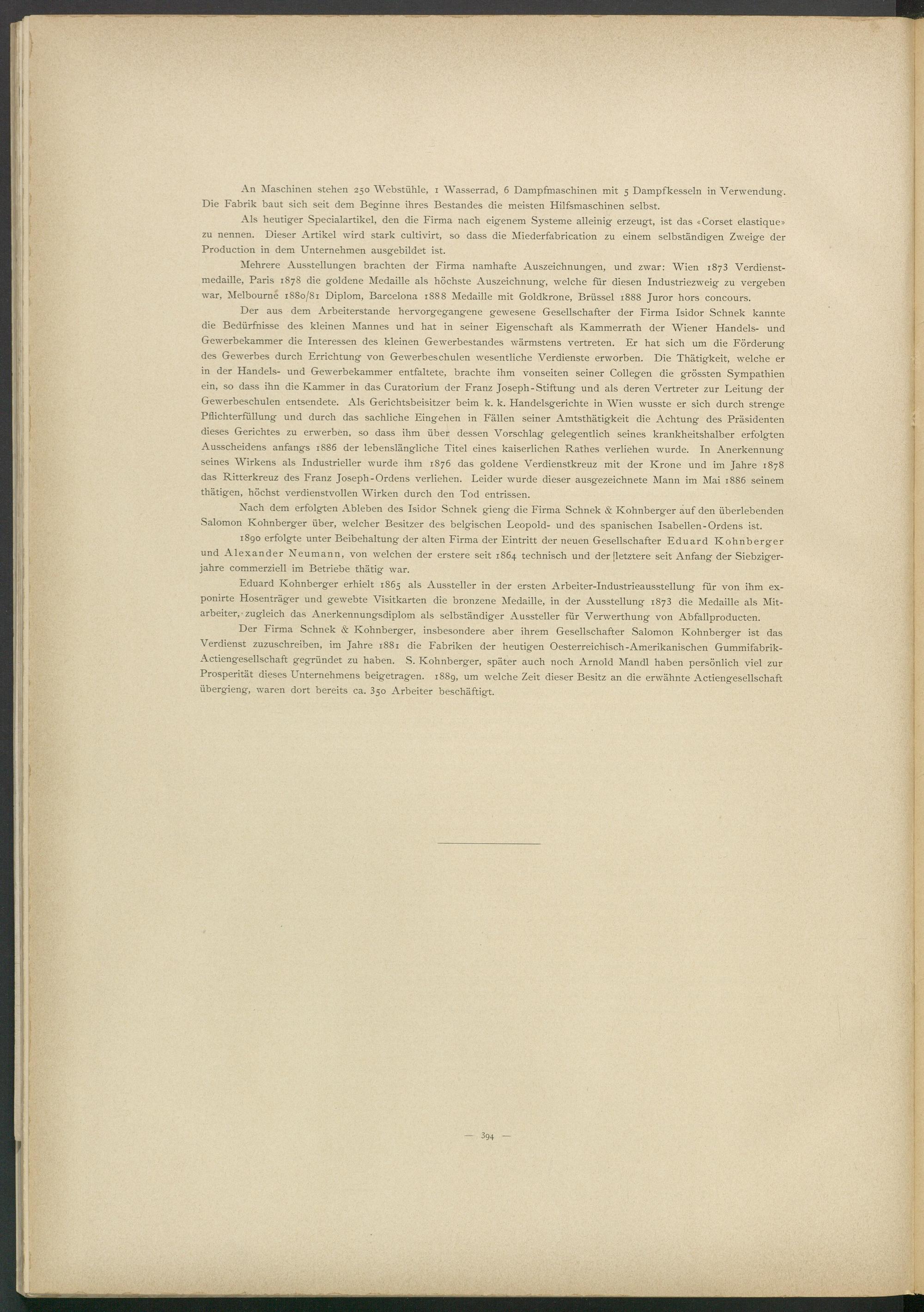 Der Firma Schnek & Kohnberger, insbesondere aber ihrem Gesellschafter Salomon Kohnberger ist das Verdienst zuzuschreiben, im Jahre 1881 die Fabriken der heutigen Oesterreichisch-Amerikanischen Gummifabrik- Actiengesellschaft gegründet zu haben. S. Kohnberger, später auch noch Arnold Mandl haben persönlich viel zur Prosperität dieses Unternehmens beigetragen. 188g, um welche Zeit dieser Besitz an die erwähnte Actiengesellschaft übergieng, waren dort bereits ca. 350 Arbeiter beschäftigt.