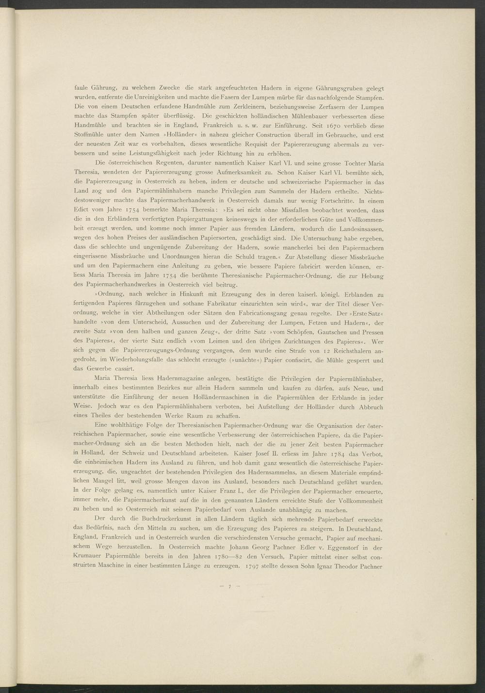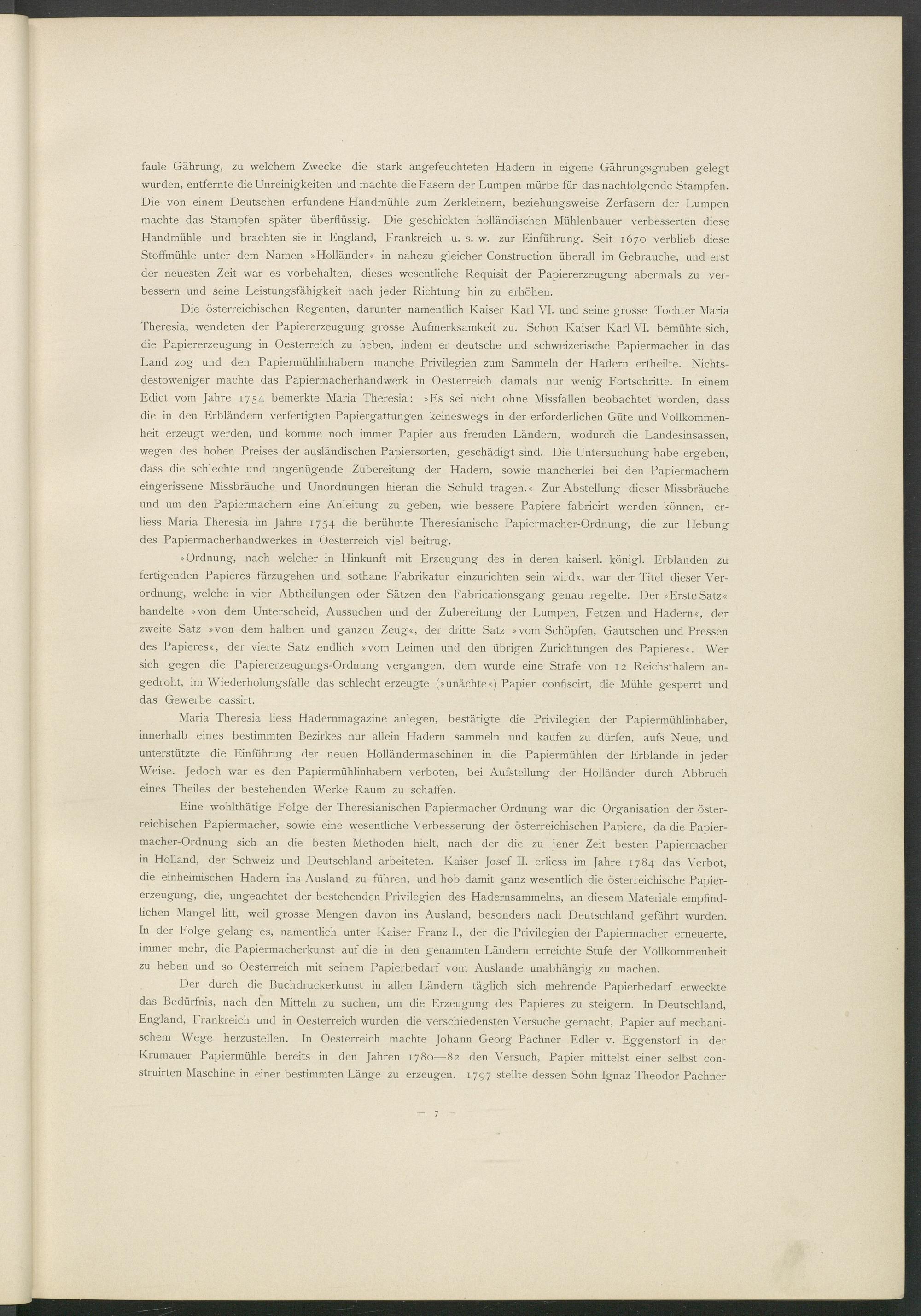 Die österreichischen Regenten, darunter namentlich Kaiser Karl VI. und seine grosse Tochter Maria Theresia, wendeten der Papiererzeugung grosse Aufmerksamkeit zu. Schon Kaiser Karl VI. bemühte sich, die Papiererzeugung in Oesterreich zu heben, indem er deutsche und schweizerische Papiermacher in das Land zog und den Papiermühlinhabern manche Privilegien zum Sammeln der Hadern ertheilte. Nichtsdestoweniger machte das Papiermacherhandwerk in Oesterreich damals nur wenig Fortschritte. In einem Edict vom Jahre 1754 bemerkte Maria Theresia: »Es sei nicht ohne Missfallen beobachtet worden, dass die in den Erbländern verfertigten Papiergattungen keineswegs in der erforderlichen Güte und Vollkommenheit erzeugt werden, und komme noch immer Papier aus fremden Ländern, wodurch die Landesinsassen, wegen des hohen Preises der ausländischen Papiersorten, geschädigt sind. Die Untersuchung habe ergeben, dass die schlechte und ungenügende Zubereitung der Hadern, sowie mancherlei bei den Papiermachern eingerissene Missbräuche und Unordnungen hieran die Schuld tragen.« Zur Abstellung dieser Missbräuche und um den Papiermachern eine Anleitung zu geben, wie bessere Papiere fabricirt werden können, er- liess Maria Theresia im Jahre 1754 die berühmte Theresianische Papiermacher-Ordnung, die zur Hebung des Papiermacherhandwerkes in Oesterreich viel beitrug.