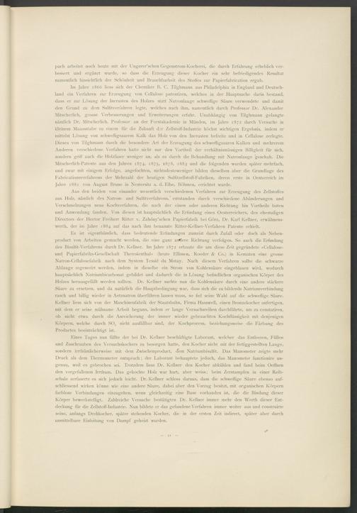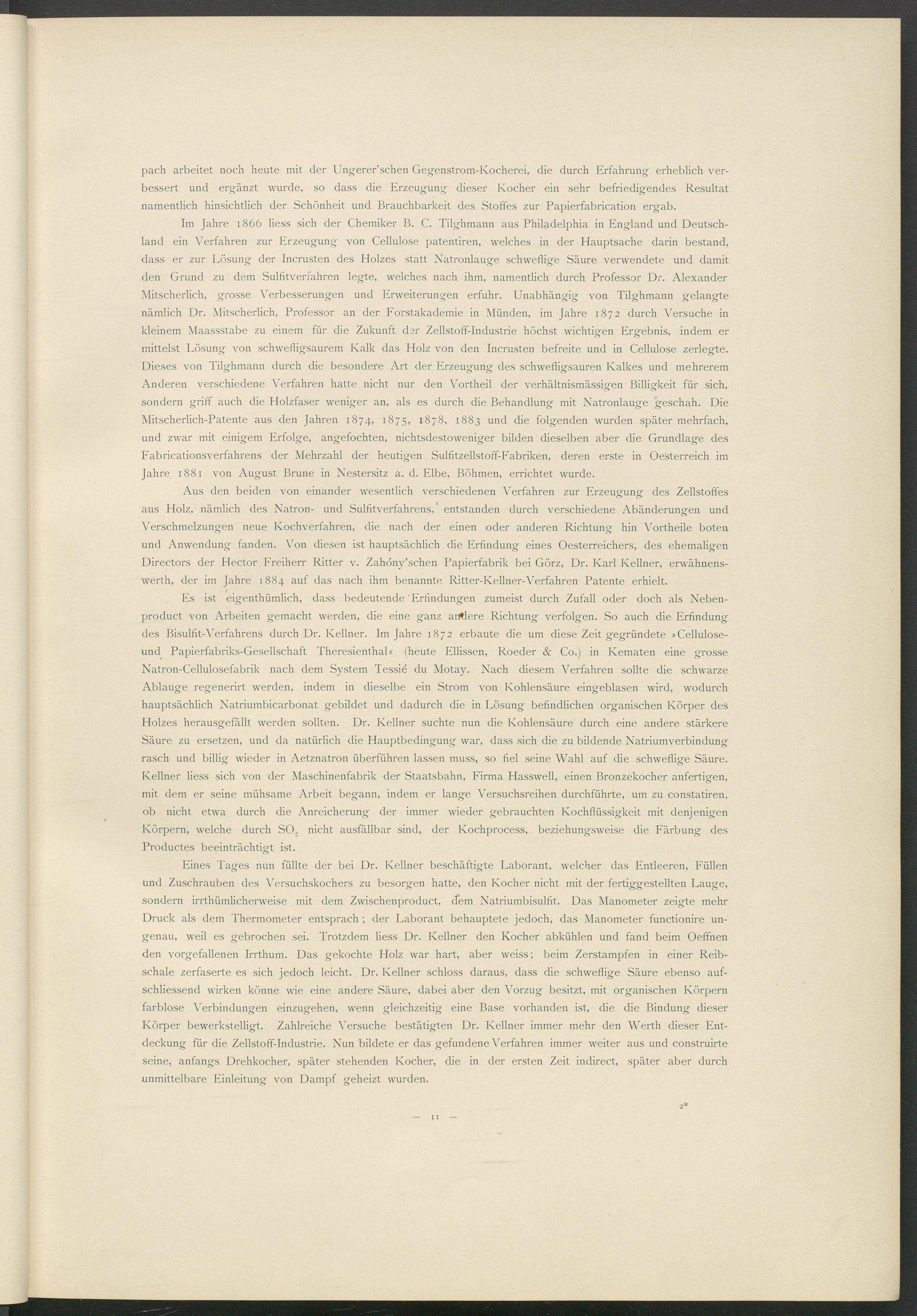 Im Jahre 1866 liess sich der Chemiker B. C. Tilghmann aus Philadelphia in England und Deutschland ein Verfahren zur Erzeugung von Cellulose patentiren, welches in der Hauptsache darin bestand, dass er zur Lösung der Incrusten des Holzes statt Natronlauge schweflige Säure verwendete und damit den Grund zu dem Sulfitverfahren legte, welches nach ihm, namentlich durch Professor Dr. Alexander Mitscherlich, grosse Verbesserungen und Erweiterungen erfuhr. Unabhängig von Tilghmann gelangte nämlich Dr. Mitscherlich, Professor an der Forstakademie in Münden, im Jahre 1872 durch Versuche in kleinem Maassstabe zu einem für die Zukunft der Zellstoff-Industrie höchst wichtigen Ergebnis, indem er mittelst Lösung von schwefligsaurem Kalk das Holz von den Incrusten befreite und in Cellulose zerlegte. Dieses von Tilghmann durch die besondere Art der Erzeugung des schwefligsauren Kalkes und mehrerem Anderen verschiedene Verfahren hatte nicht nur den Vortheil der verhältnismässigen Billigkeit für sich, sondern griff auch die Holzfaser weniger an, als es durch die Behandlung mit Natronlauge geschah. Die Mitscherlich-Patente aus den Jahren 1874, 1875, 1878, 1883 und die folgenden wurden später mehrfach, und zwar mit einigem Erfolge, angefochten, nichtsdestoweniger bilden dieselben aber die Grundlage des Fabricationsverfahrens der Mehrzahl der heutigen Sulfitzellstoff-Fabriken, deren erste in Oesterreich im Jahre 1881 von August Brune in Nestersitz a. d. Elbe, Böhmen, errichtet wurde.