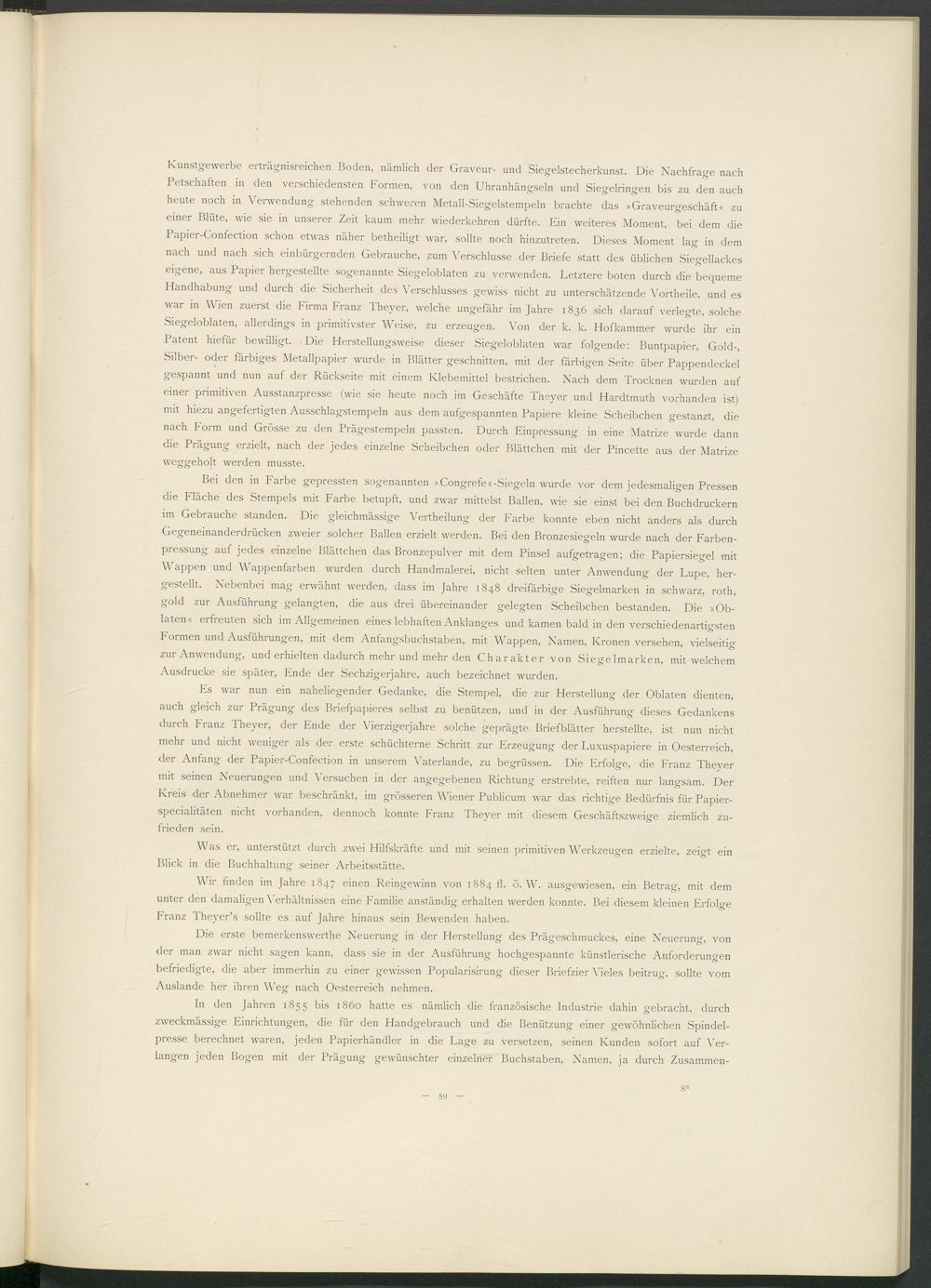 Kunstgewerbe erträgnisreichen Boden, nämlich der Graveur- und Siegelstecherkunst. Die Nachfrage nach Petschaften in den verschiedensten Formen, von den Uhranhängseln und Siegelringen bis zu den auch heute noch in Verwendung stehenden schweren Metall-Siegelstempeln brachte das »Graveurgeschäft« zu einer Blüte, wie sie in unserer Zeit kaum mehr wiederkehren dürfte. Ein weiteres Moment, bei dem die Papier-Confection schon etwas näher betheiligt war, sollte noch hinzutreten. Dieses Moment lag in dem nach und nach sich einbürgernden Gebrauche, zum Verschlüsse der Briefe statt des üblichen Siegellackes eigene, aus Papier hergestellte sogenannte Siegeloblaten zu verwenden. Letztere boten durch die bequeme Handhabung und durch die Sicherheit des Verschlusses gewiss nicht zu unterschätzende Vortheile, und es war in Wien zuerst die Firma Franz Theyer, welche ungefähr im Jahre 1836 sich darauf verlegte, solche Siegeloblaten, allerdings in primitivster Weise, zu erzeugen. Von der k. k. Hofkammer wurde ihr ein Patent hiefür bewilligt. Die Herstellungsweise dieser Siegeloblaten war folgende: Buntpapier, Gold-, Silber- oder färbiges Metallpapier wurde in Blätter geschnitten, mit der farbigen Seite über Pappendeckel gespannt und nun auf der Rückseite mit einem Klebemittel bestrichen. Nach dem Trocknen wurden auf einer primitiven Ausstanzpresse (wie sie heute noch im Geschäfte Theyer und Hardtmuth vorhanden ist) mit hiezu angefertigten Ausschlagstempeln aus dem aufgespannten Papiere kleine Scheibchen gestanzt, die nach Form und Grösse zu den Prägestempeln passten. Durch Einpressung in eine Matrize wurde dann die Prägung erzielt, nach der jedes einzelne Scheibchen oder Blättchen mit der Pincette aus der Matrize weggeholt werden musste.