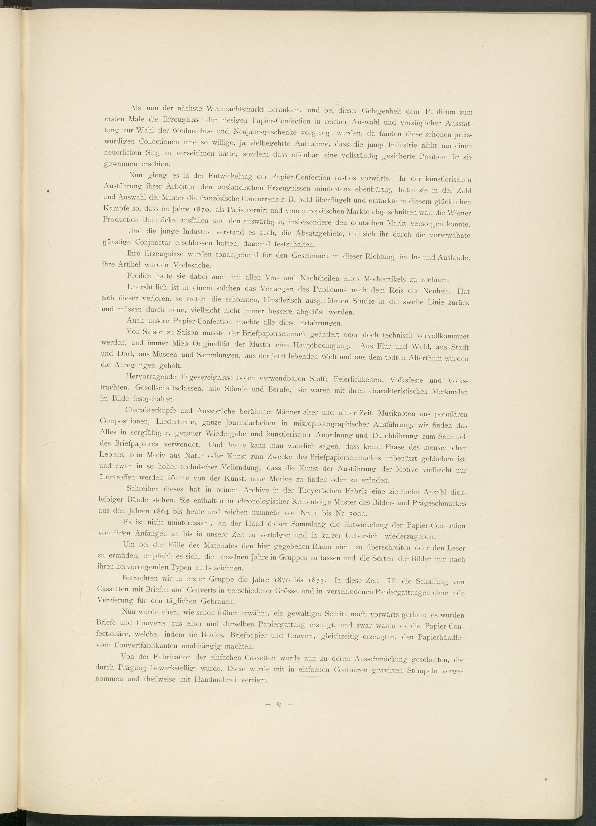 Als nun der nächste Weihnachtsmarkt herankam, und bei dieser Gelegenheit dem Publicum zum ersten Male die Erzeugnisse der hiesigen Papier-Confection in reicher Auswahl und vorzüglicher Ausstattung zur Wahl der Weihnachts- und Neujahrsgeschenke vorgelegt wurden, da fanden diese schönen preiswürdigen Collectionen eine so willige, ja vielbegehrte Aufnahme, dass die junge Industrie nicht nur einen neuerlichen Sieg zu verzeichnen hatte, sondern dass offenbar eine vollständig gesicherte Position für sie gewonnen erschien.