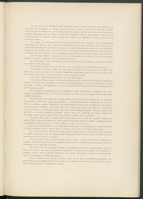 Schreiber dieses hat in seinem Archive in der Theyer’schen Fabrik eine ziemliche Anzahl dickleibiger Bände stehen. Sie enthalten in chronologischer Reihenfolge Muster des Bilder- und Prägeschmuckes aus den Jahren 1864 bis heute und reichen nunmehr von Nr. 1 bis Nr. 5000.
