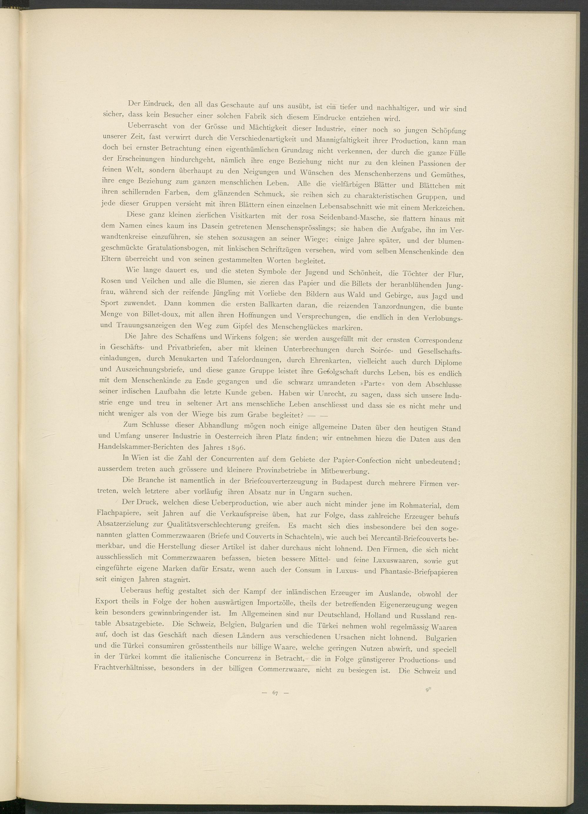 Die Jahre des Schaffens und Whrkens folgen; sie werden ausgefüllt mit der ernsten Correspondenz in Geschäfts- und Privatbriefen, aber mit kleinen Unterbrechungen durch Soirée- und Gesellschaftseinladungen, durch Menukarten und Tafelordnungen, durch Ehrenkarten, vielleicht auch durch Diplome und Auszeichnungsbriefe, und diese ganze Gruppe leistet ihre Gefolgschaft durchs Leben, bis es endlich mit dem Menschenkinde zu Ende gegangen und die schwarz umrandeten »Parte« von dem Abschlüsse seiner irdischen Laufbahn die letzte Kunde geben. Haben wir Unrecht, zu sagen, dass sich unsere Industrie enge und treu in seltener Art ans menschliche Leben anschliesst und dass sie es nicht mehr und nicht weniger als von der Wflege bis zum Grabe begleitet? — —