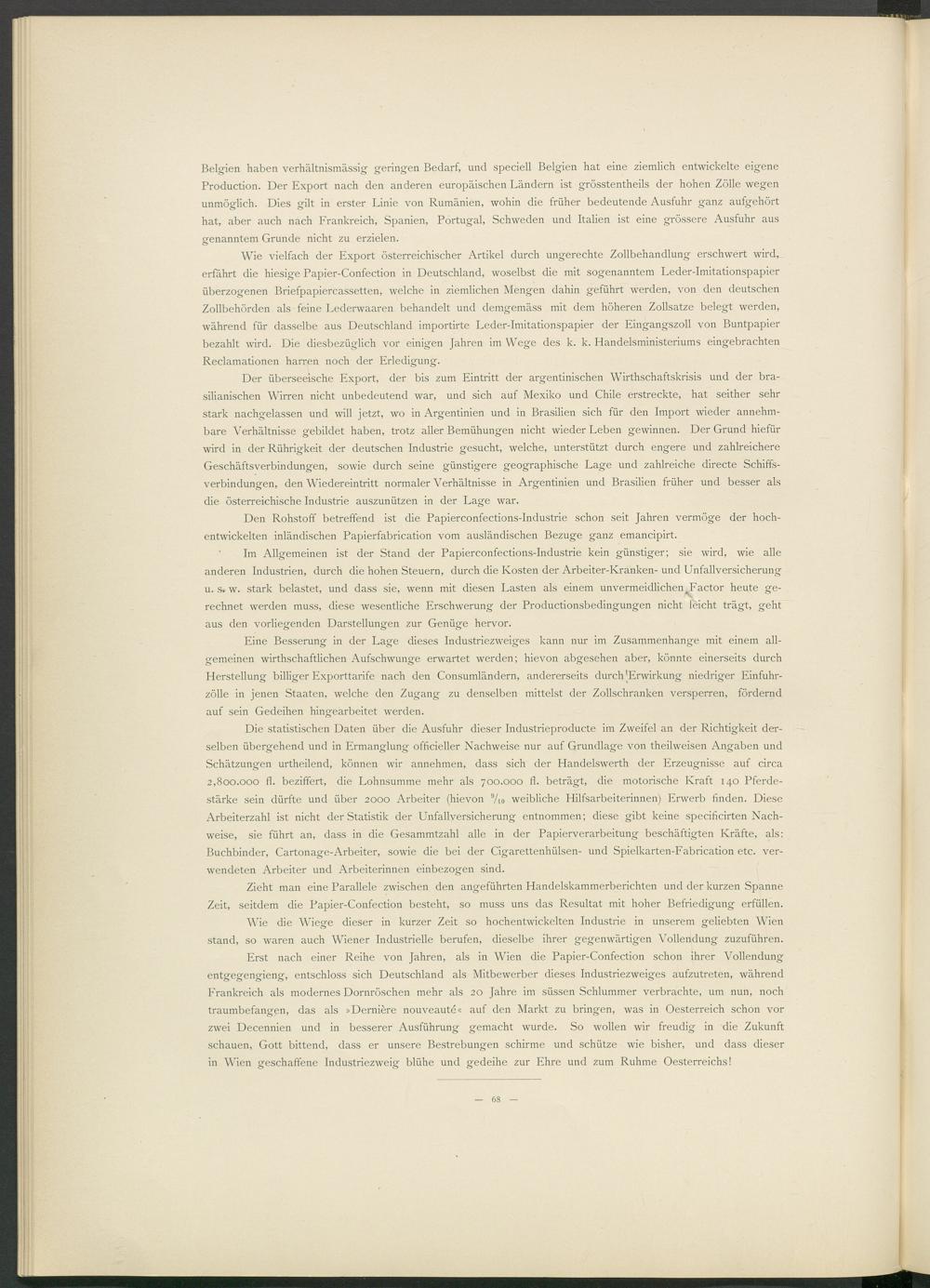 Zieht man eine Parallele zwischen den angeführten Handelskammerberichten und der kurzen Spanne Zeit, seitdem die Papier-Confection besteht, so muss uns das Resultat mit hoher Befriedigung erfüllen.