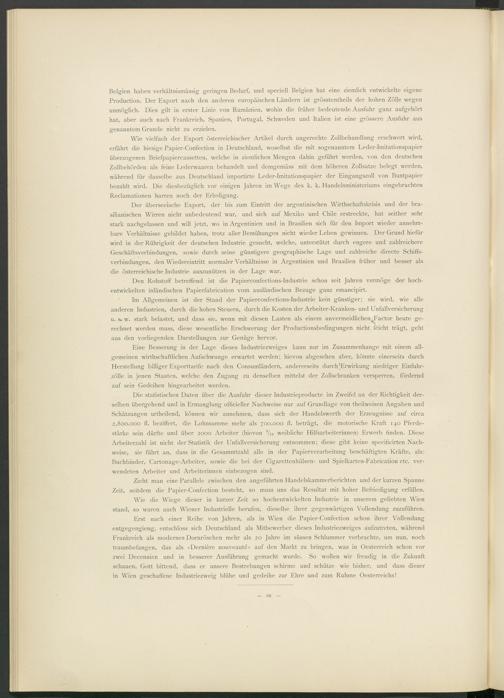 Erst nach einer Reihe von Jahren, als in Wien die Papier-Confection schon ihrer Vollendung entgegengieng, entschloss sich Deutschland als Mitbewerber dieses Industriezweiges aufzutreten, während Frankreich als modernes Dornröschen mehr als 20 Jahre im süssen Schlummer verbrachte, um nun, noch traumbefangen, das als »Dernière nouveauté« auf den Markt zu bringen, was in Oesterreich schon vor zwei Decennien und in besserer Ausführung gemacht wurde. So wollen wir freudig in die Zukunft schauen, Gott bittend, dass er unsere Bestrebungen schirme und schütze wie bisher, und dass dieser in Wien geschaffene Industriezweig blühe und gedeihe zur Ehre und zum Ruhme Oesterreichs!