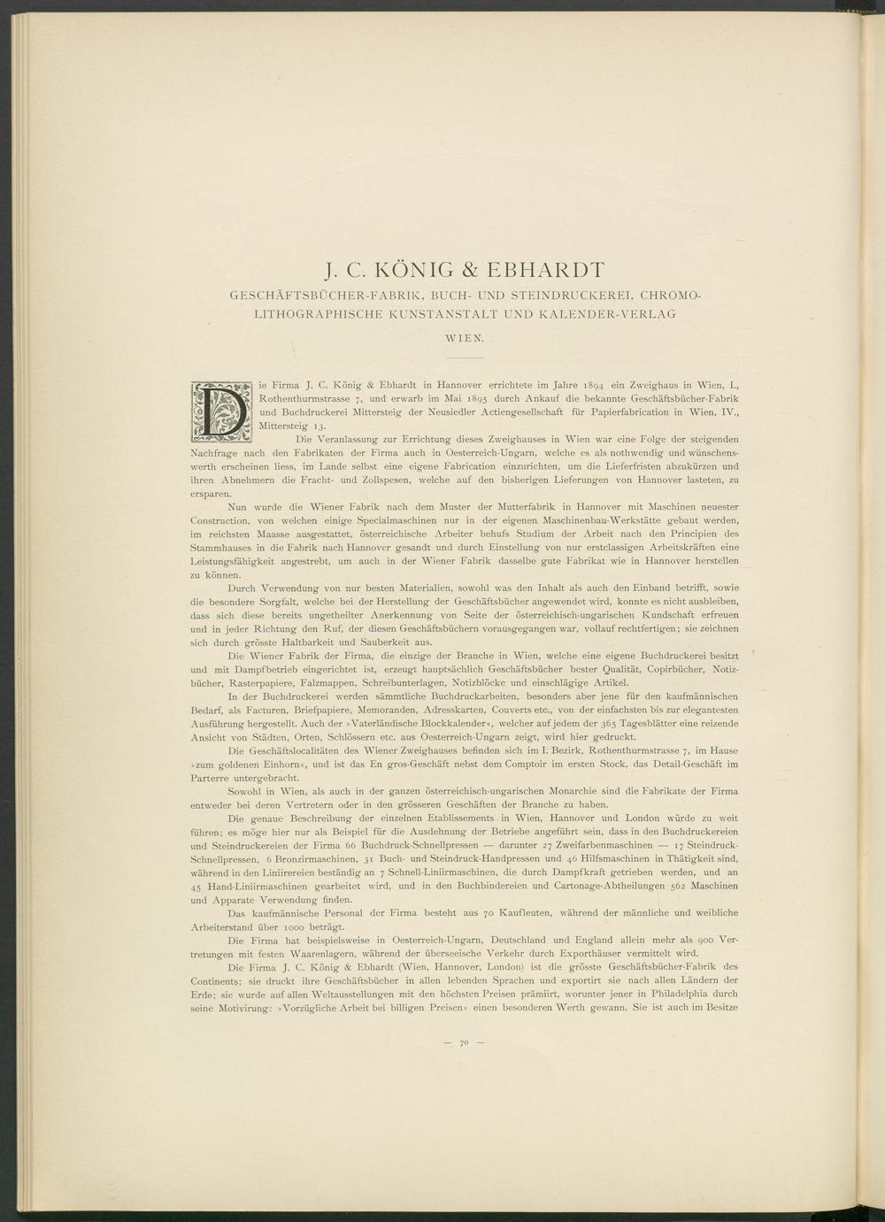 Die Firma J. C. König & Ebhardt (Wien, Hannover, London) ist die grösste Geschäftsbücher-Fabrik des Continents; sie druckt ihre Geschäftsbücher in allen lebenden Sprachen und exportirt sie nach allen Ländern der Erde; sie wurde auf allen Weltausstellungen mit den höchsten Preisen prämiirt, worunter jener in Philadelphia durch seine Motivirung: »Vorzügliche Arbeit bei billigen Preisen« einen besonderen Werth gewann. Sie ist auch im Besitze