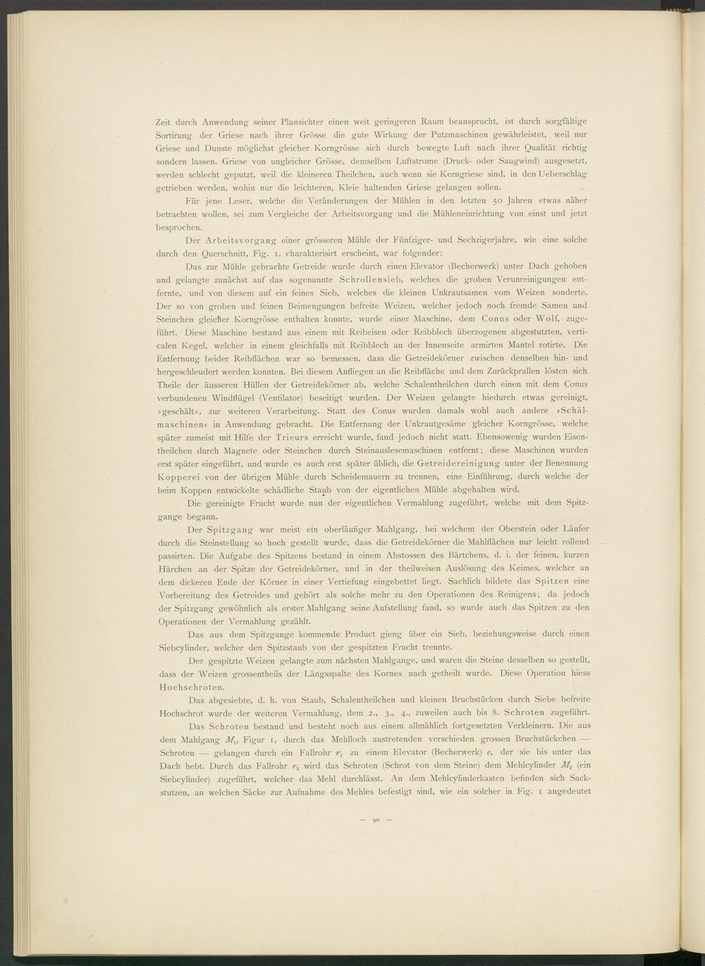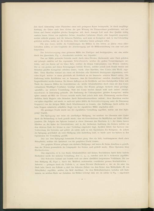 Das zur Mühle gebrachte Getreide wurde durch einen Elevator (Becherwerk) unter Dach gehoben und gelangte zunächst auf das sogenannte Schrollensieb, welches die groben Verunreinigungen entfernte, und von diesem auf ein feines Sieb, welches die kleinen Unkrautsamen vom Weizen sonderte. Der so von groben und feinen Beimengungen befreite Weizen, welcher jedoch noch fremde Samen und Sternchen gleicher Korngrösse enthalten konnte, wurde einer Maschine, dem Conus oder Wolf, zugeführt. Diese Maschine bestand aus einem mit Reibeisen oder Reibblech überzogenen abgestutzten, verti- calen Kegel, welcher in einem gleichfalls mit Reibblech an der Innenseite armirten Mantel rotirte. Die Entfernung beider Reibflächen war so bemessen, dass die Getreidekörner zwischen denselben hin- und hergeschleudert werden konnten. Bei diesem Anfliegen an die Reibfläche und dem Zurückprallen lösten sich Theile der äusseren Hüllen der Getreidekörner ab, welche Schalentheilchen durch einen mit dem Conus verbundenen Windflügel (Ventilator) beseitigt wurden. Der Weizen gelangte hiedurch etwas gereinigt, »geschält«, zur weiteren Verarbeitung. Statt des Conus wurden damals wohl auch andere »Schälmaschinen« in Anwendung gebracht. Die Entfernung der Unkrautgesäme gleicher Korngrösse, welche später zumeist mit Hilfe der Trieurs erreicht wurde, fand jedoch nicht statt. Ebensowenig wurden Eisen- theilchen durch Magnete oder Sternchen durch Steinauslesemaschinen entfernt; diese Maschinen wurden erst später eingeführt, und wurde es auch erst später üblich, die Getreidereinigung unter der Benennung Köpper ei von der übrigen Mühle durch Scheidemauern zu trennen, eine Einführung, durch welche der beim Koppen entwickelte schädliche Staub von der eigentlichen Mühle abgehalten wird.