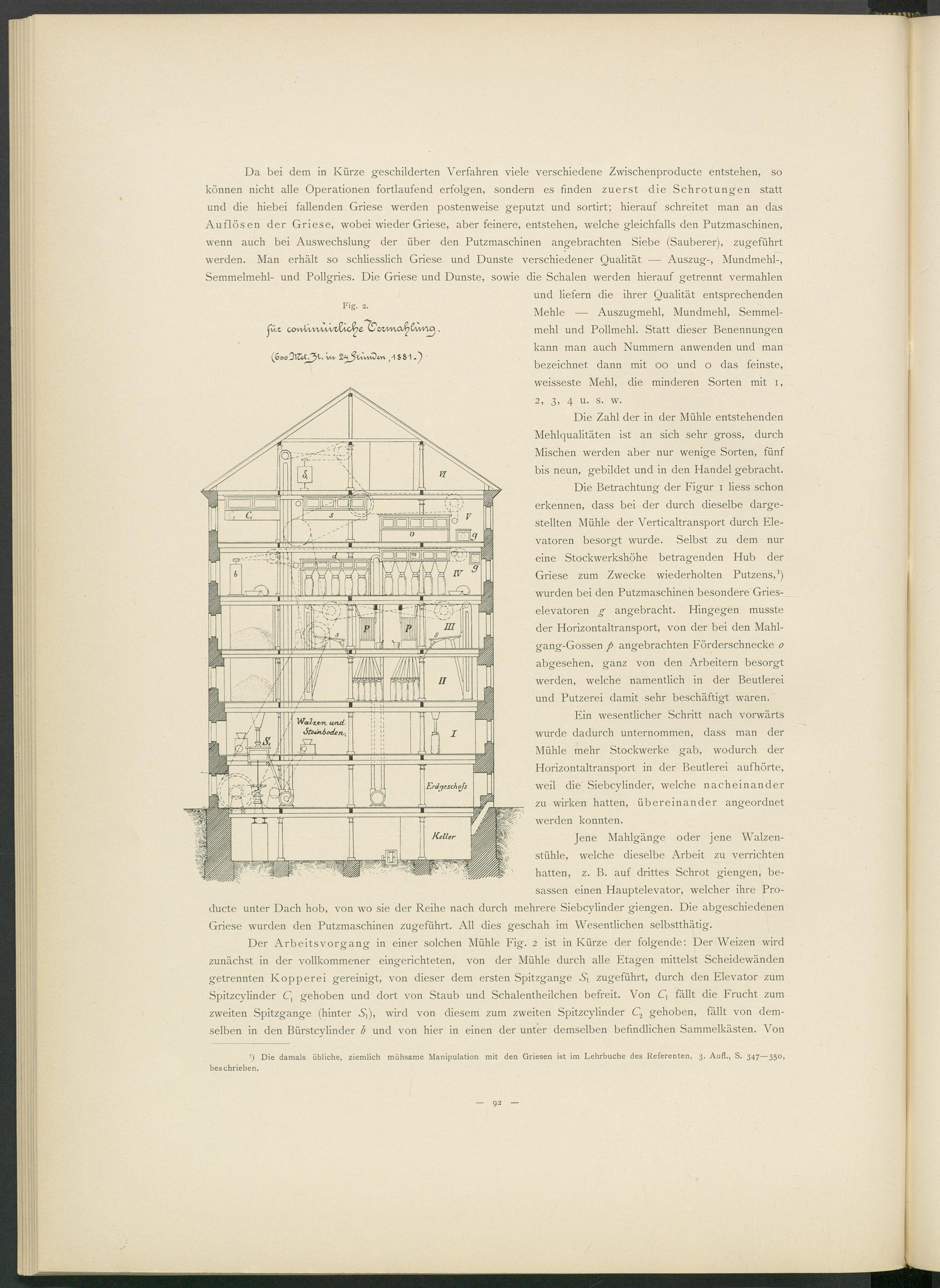 Der Arbeitsvorgang in einer solchen Mühle Fig. 2 ist in Kürze der folgende: Der Weizen wird zunächst in der vollkommener eingerichteten, von der Mühle durch alle Etagen mittelst Scheidewänden getrennten Kopperei gereinigt, von dieser dem ersten Spitzgange zugeführt, durch den Elevator zum Spitzcylinder C t gehoben und dort von Staub und Schalentheilchen befreit. Von Cj fällt die Frucht zum zweiten Spitzgange (hinter V,), wird von diesem zum zweiten Spitzcylinder C 2 gehoben, fällt von demselben in den Bürstcylinder b und von hier in einen der unter demselben befindlichen Sammelkästen. Von