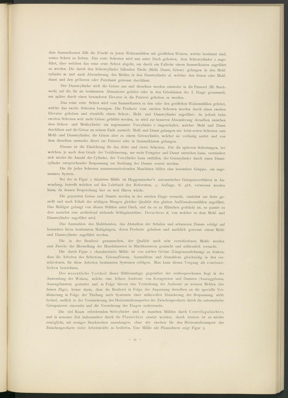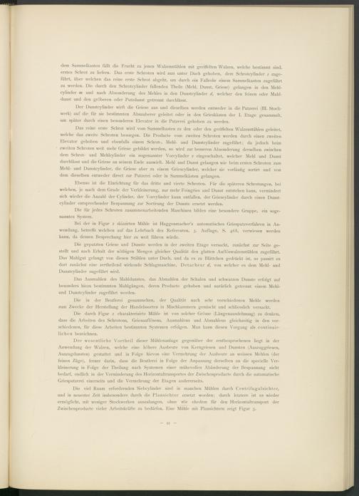 Die durch Figur 2 charakterisirte Mühle ist von solcher Grösse (Längenausdehnung) zu denken, dass die Arbeiten des Schrotens, Griesauflösens, Ausmahlens und Abmahlens gleichzeitig in den verschiedenen, für diese Arbeiten bestimmten Systemen erfolgen. Man kann diesen Vorgang als continuir- lichen bezeichnen.