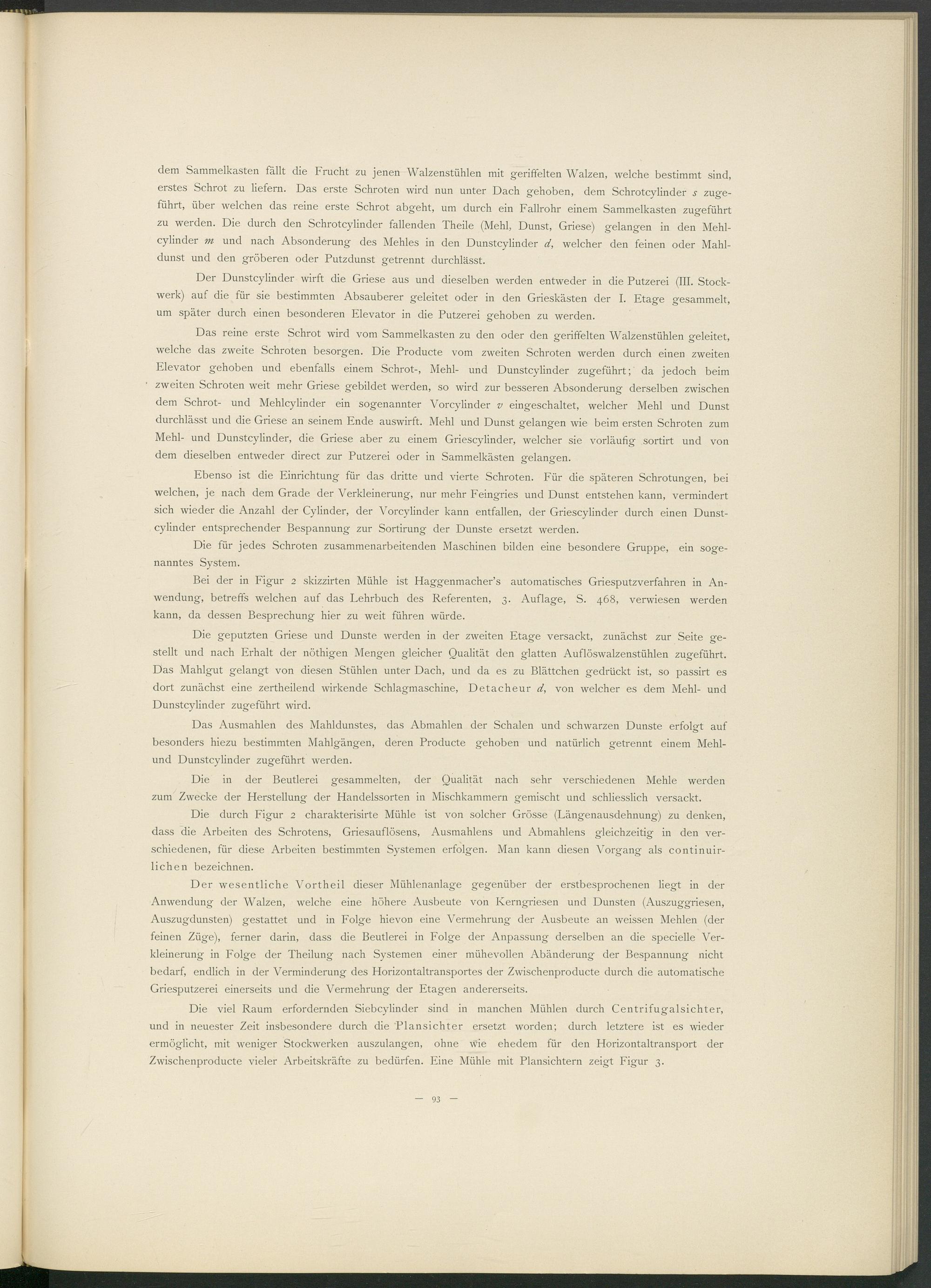 Der wesentliche Vortheil dieser Mühlenanlage gegenüber der erstbesprochenen liegt in der Anwendung der Walzen, welche eine höhere Ausbeute von Kerngriesen und Dunsten (Auszuggriesen, Auszugdunsten) gestattet und in Folge hievon eine Vermehrung der Ausbeute an weissen Mehlen (der feinen Züge), ferner darin, dass die Beutlerei in Folge der Anpassung derselben an die specielle Verkleinerung in Folge der Theilung nach Systemen einer mühevollen Abänderung der Bespannung nicht bedarf, endlich in der Verminderung des Horizontaltransportes der Zwischenproducte durch die automatische Griesputzerei einerseits und die Vermehrung der Etagen andererseits.