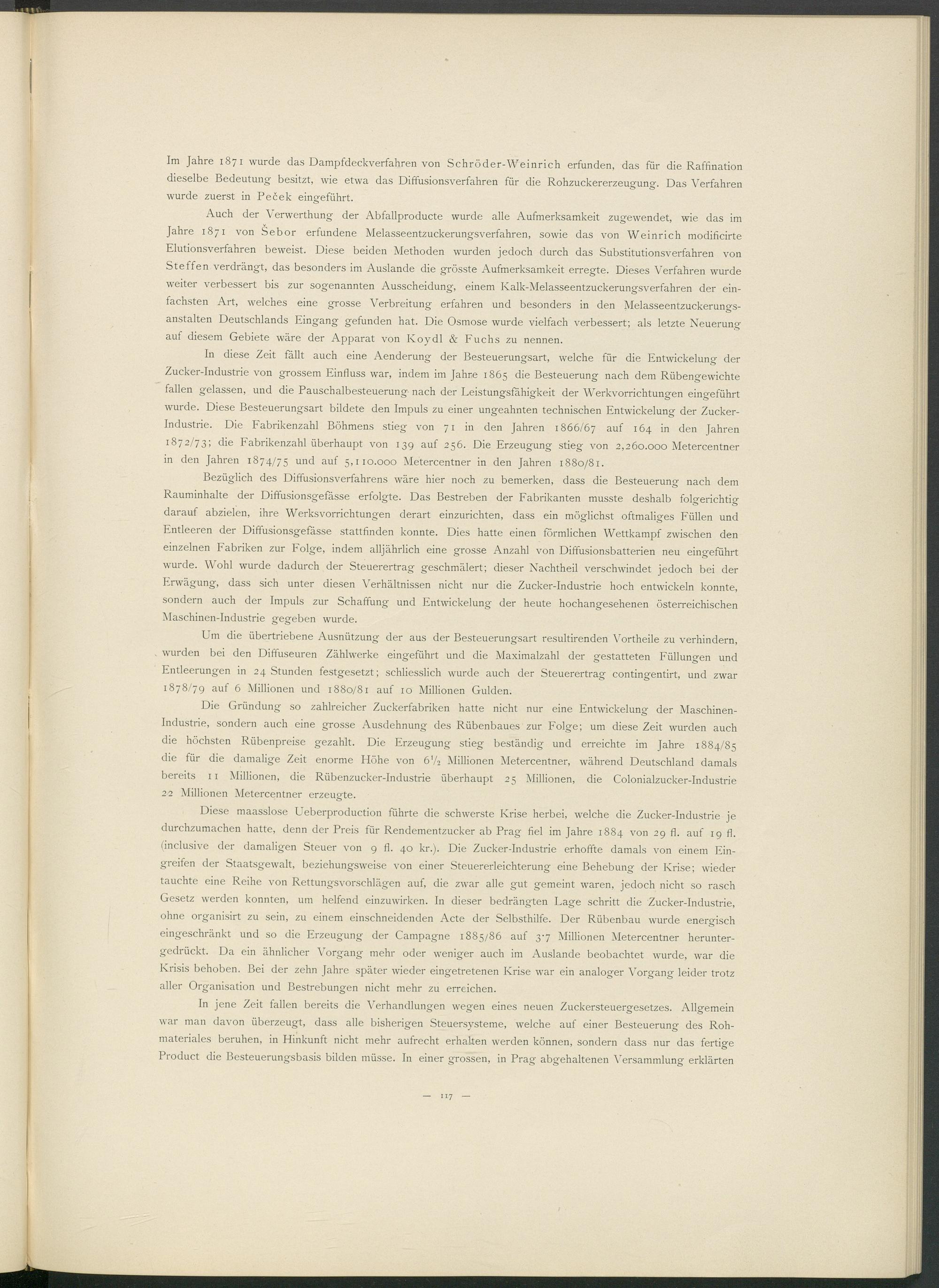 Diese maasslose Ueberproduction führte die schwerste Krise herbei, welche die Zucker-Industrie je durchzumachen hatte, denn der Preis für Rendementzucker ab Prag fiel im Jahre 1884 von 29 fl. auf 19 fl. (inclusive der damaligen Steuer von 9 fl. 40 kr.). Die Zucker-Industrie erhoffte damals von einem Eingreifen der Staatsgewalt, beziehungsweise von einer Steuererleichterung eine Behebung der Krise; wieder tauchte eine Reihe von Rettungsvorschlägen auf, die zwar alle gut gemeint waren, jedoch nicht so rasch Gesetz werden konnten, um helfend einzuwirken. In dieser bedrängten Lage schritt die Zucker-Industrie, ohne organisirt zu sein, zu einem einschneidenden Acte der Selbsthilfe. Der Rübenbau wurde energisch eingeschränkt und so die Erzeugung der Campagne 1885/86 auf 3-7 Millionen Metercentner heruntergedrückt. Da ein ähnlicher Vorgang mehr oder weniger auch im Auslande beobachtet wurde, war die Krisis behoben. Bei der zehn Jahre später wieder eingetretenen Krise war ein analoger Vorgang leider trotz aller Organisation und Bestrebungen nicht mehr zu erreichen.