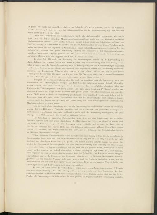 In diese Zeit fällt auch eine Aenderung der Besteuerungsart, welche für die Entwickelung der Zucker-Industrie von grossem Einfluss war, indem im Jahre 1865 die Besteuerung nach dem Rübengewichte fallen gelassen, und die Pauschalbesteuerung nach der Leistungsfähigkeit der Werkvorrichtungen eingeführt wurde. Diese Besteuerungsart bildete den Impuls zu einer ungeahnten technischen Entwickelung der Zucker- Industrie. Die Fabrikenzahl Böhmens stieg von 71 in den Jahren 1866/67 auf 164 in den Jahren 1872/73; die Fabrikenzahl überhaupt von 139 auf 256. Die Erzeugung stieg von 2,260.000 Metercentner in den Jahren 1874/75 un d auf 5,110.000 Metercentner in den Jahren 1880/81.