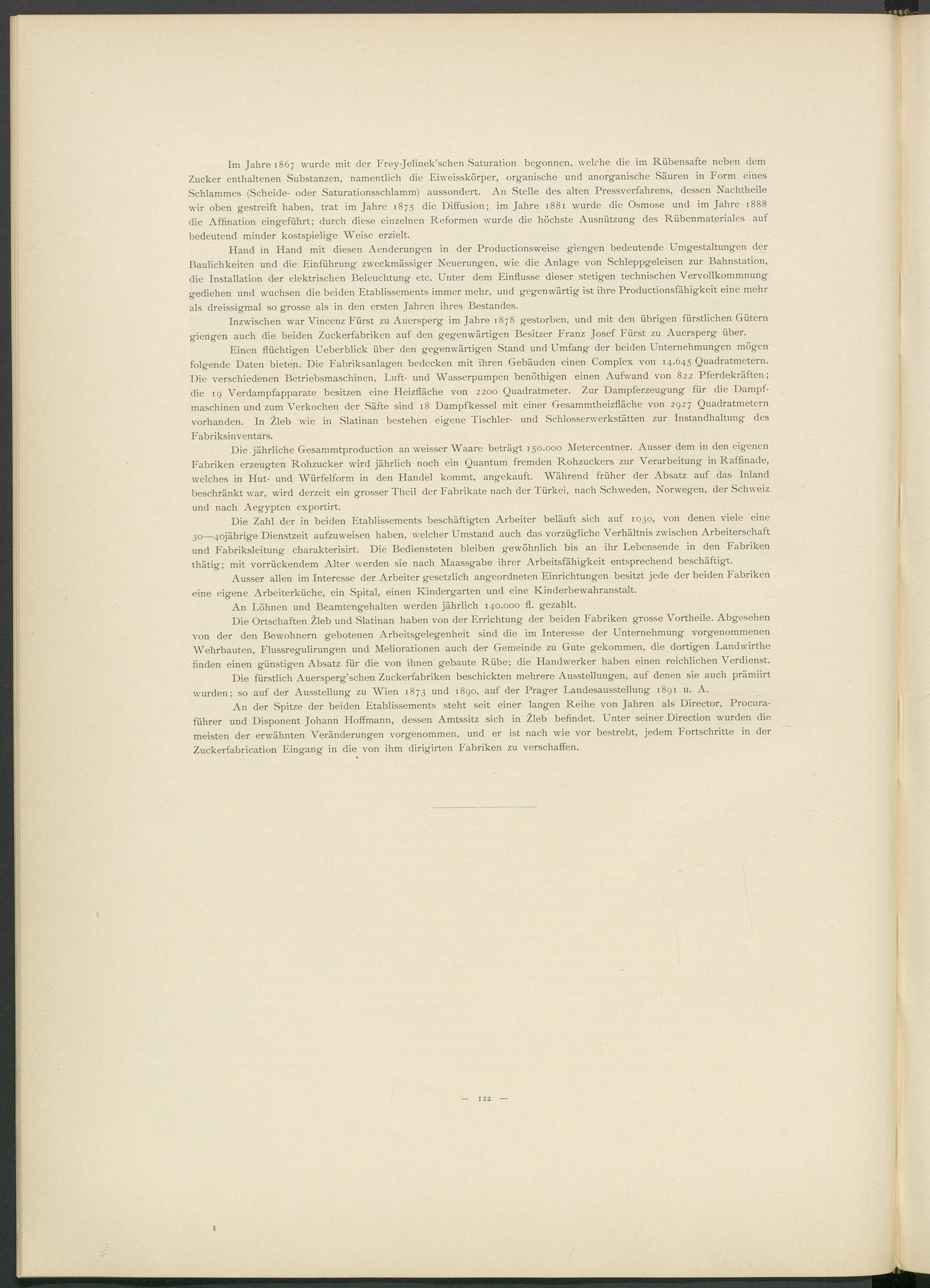 An der Spitze der beiden Etablissements steht seit einer langen Reihe von Jahren als Director, Procura- führer und Disponent Johann Hoffmann, dessen Amtssitz sich in Zleb befindet. Unter seiner Direction wurden die meisten der erwähnten Veränderungen vorgenommen, und er ist nach wie vor bestrebt, jedem Fortschritte in der Zuckerfabrication Eingang in die von ihm dirigirten Fabriken zu verschaffen.