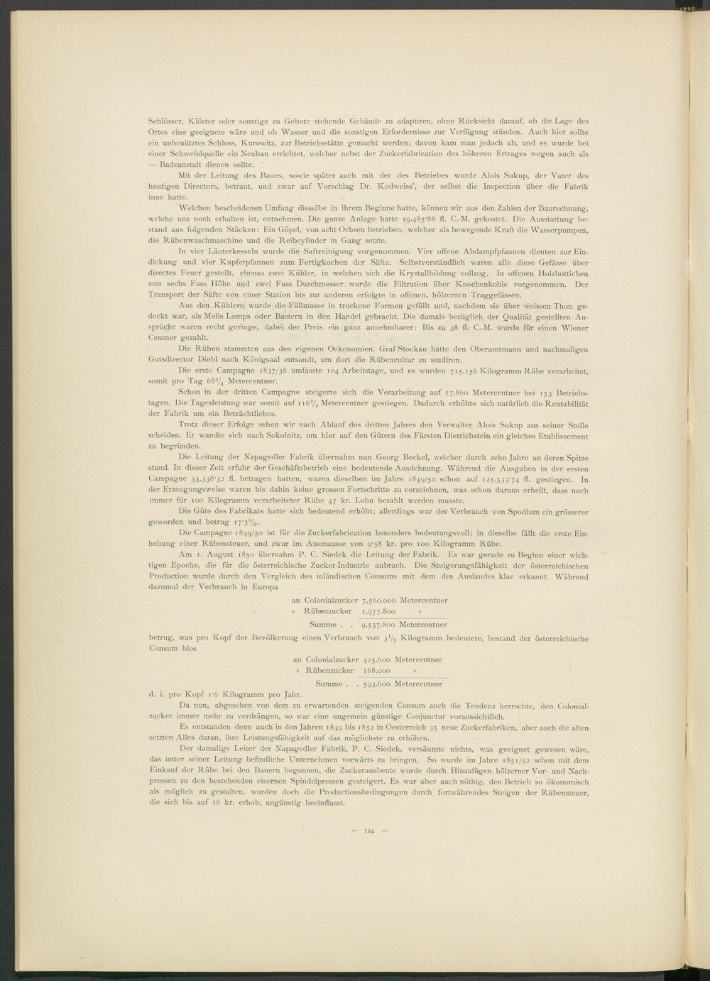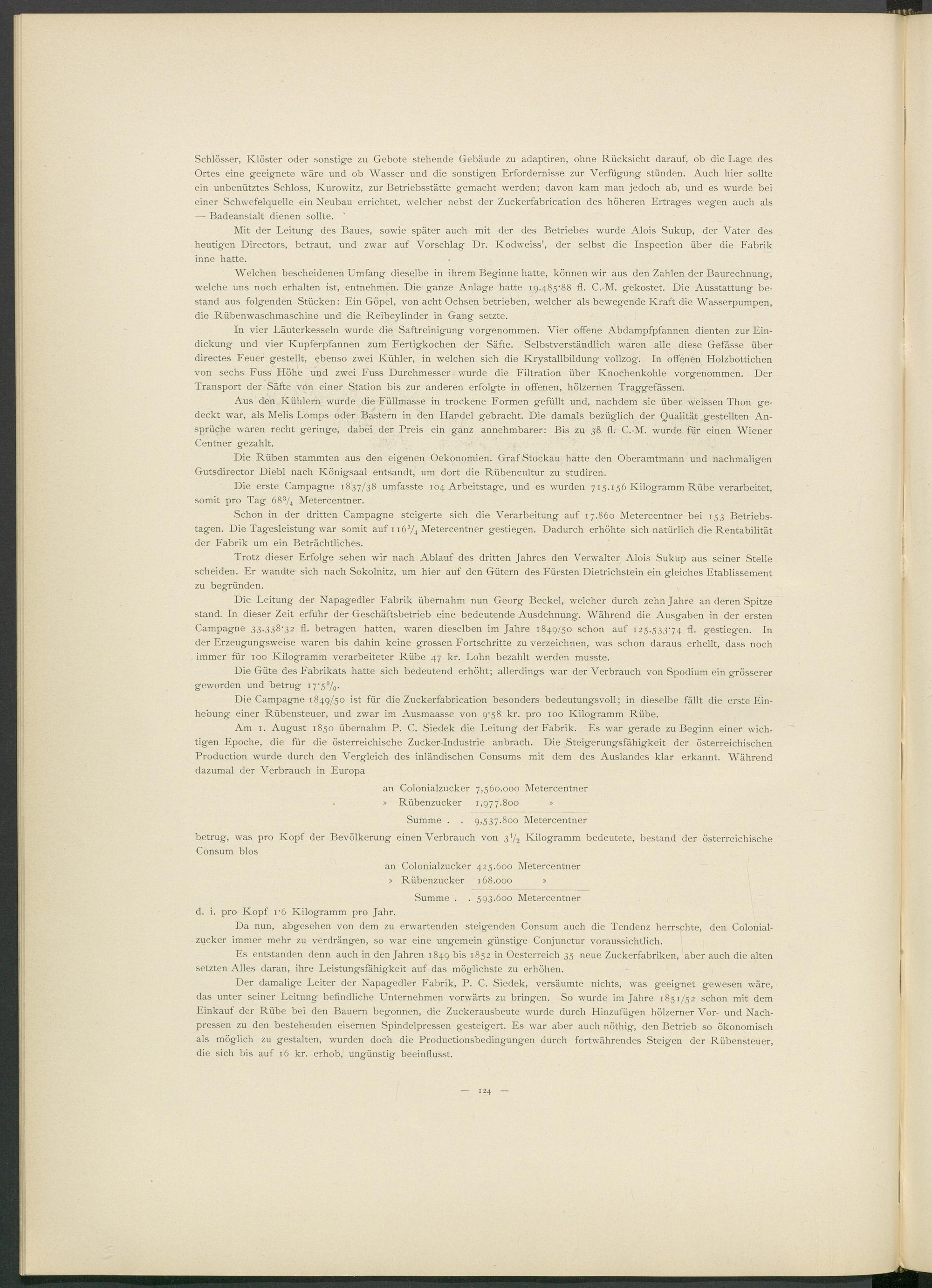 x\m 1. August 1850 übernahm P. C. Siedek die Leitung der Fabrik. Es war gerade zu Beginn einer wichtigen Epoche, die für die österreichische Zucker-Industrie anbrach. Die Steigerungsfähigkeit der österreichischen Production wurde durch den Vergleich des inländischen Consums mit dem des Auslandes klar erkannt. Während dazumal der Verbrauch in Europa
