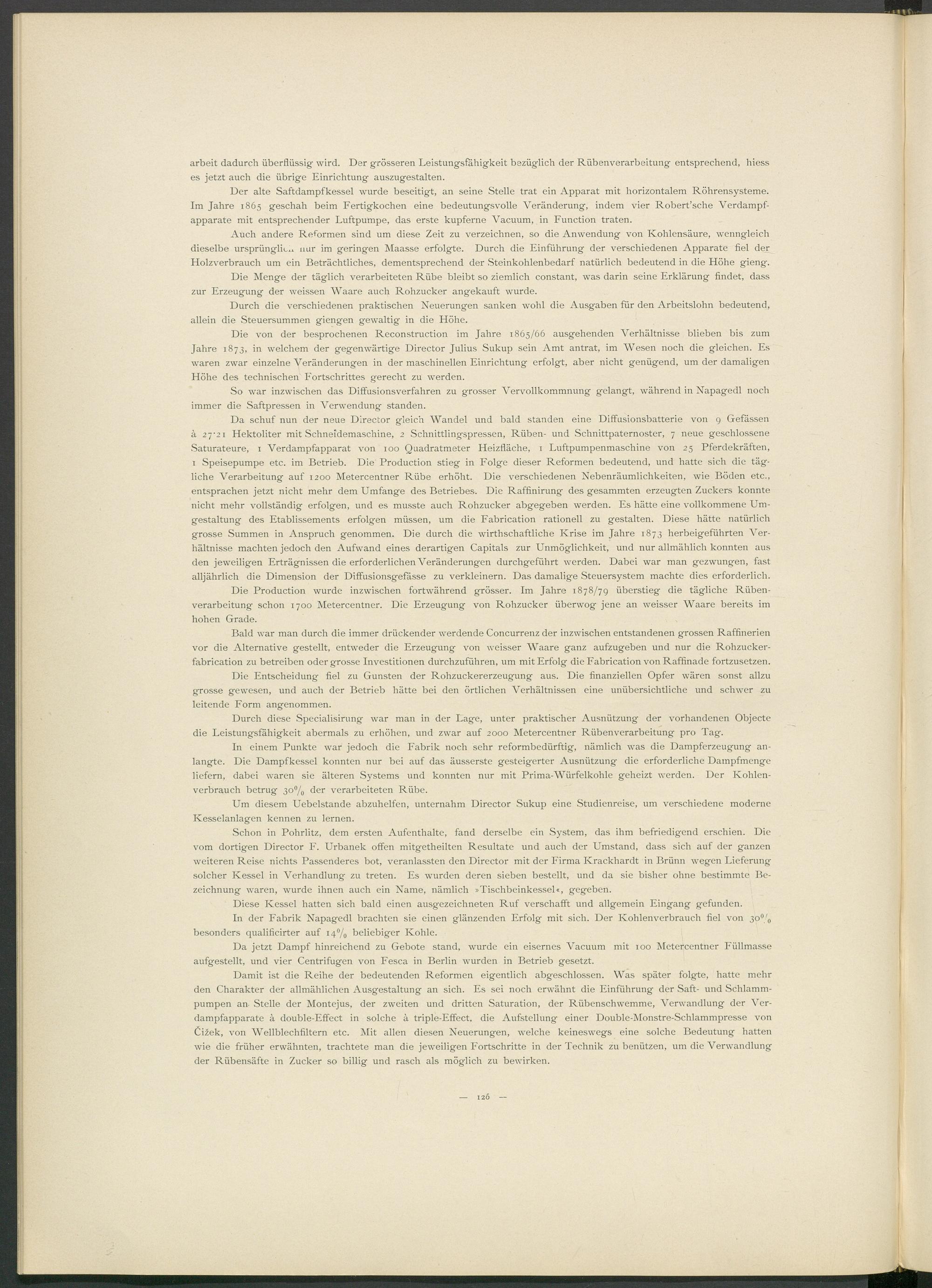 1 Speisepumpe etc. im Betrieb. Die Production stieg in Folge dieser Reformen bedeutend, und hatte sich die tägliche Verarbeitung auf 1200 Metercentner Rübe erhöht. Die verschiedenen Nebenräumlichkeiten, wie Böden etc., entsprachen jetzt nicht mehr dem Umfange des Betriebes. Die Raffinirung des gesammten erzeugten Zuckers konnte nicht mehr vollständig erfolgen, und es musste auch Rohzucker abgegeben werden. Es hätte eine vollkommene Umgestaltung des Etablissements erfolgen müssen, um die Fabrication rationell zu gestalten. Diese hätte natürlich grosse Summen in Anspruch genommen. Die durch die wirthschaftliche Krise im Jahre 1873 herbeigeführten Verhältnisse machten jedoch den Aufwand eines derartigen Capitals zur Unmöglichkeit, und nur allmählich konnten aus den jeweiligen Erträgnissen die erforderlichen Veränderungen durchgeführt werden. Dabei war man gezwungen, fast alljährlich die Dimension der Diffusionsgefässe zu verkleinern. Das damalige Steuersystem machte dies erforderlich.