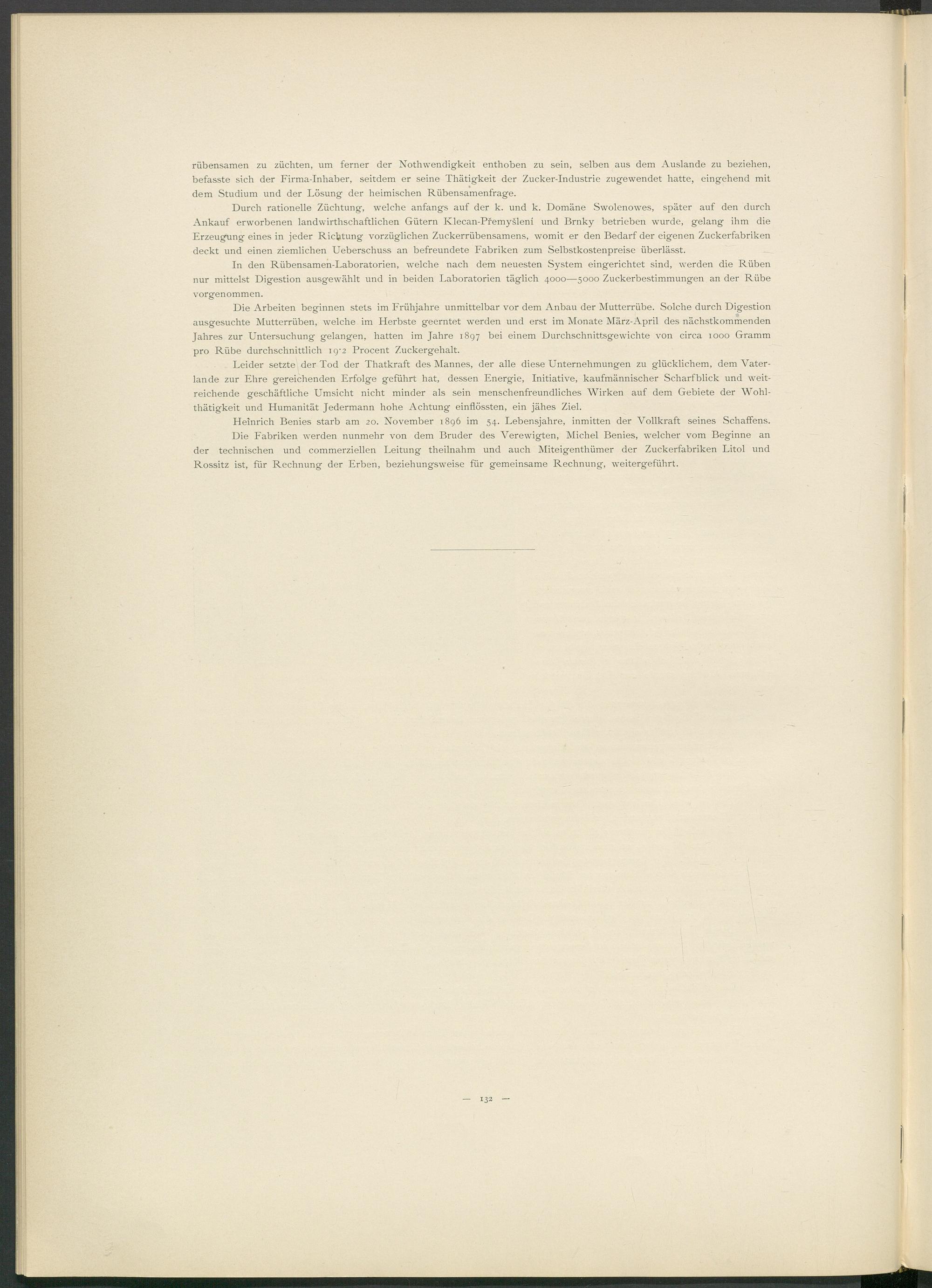 Die Fabriken werden nunmehr von dem Bruder des Verewigten, Michel Benies, welcher vom Beginne an der technischen und commerziellen Leitung theilnahm und auch Miteigenthümer der Zuckerfabriken Litol und Rossitz ist, für Rechnung der Erben, beziehungsweise für gemeinsame Rechnung, weitergeführt.