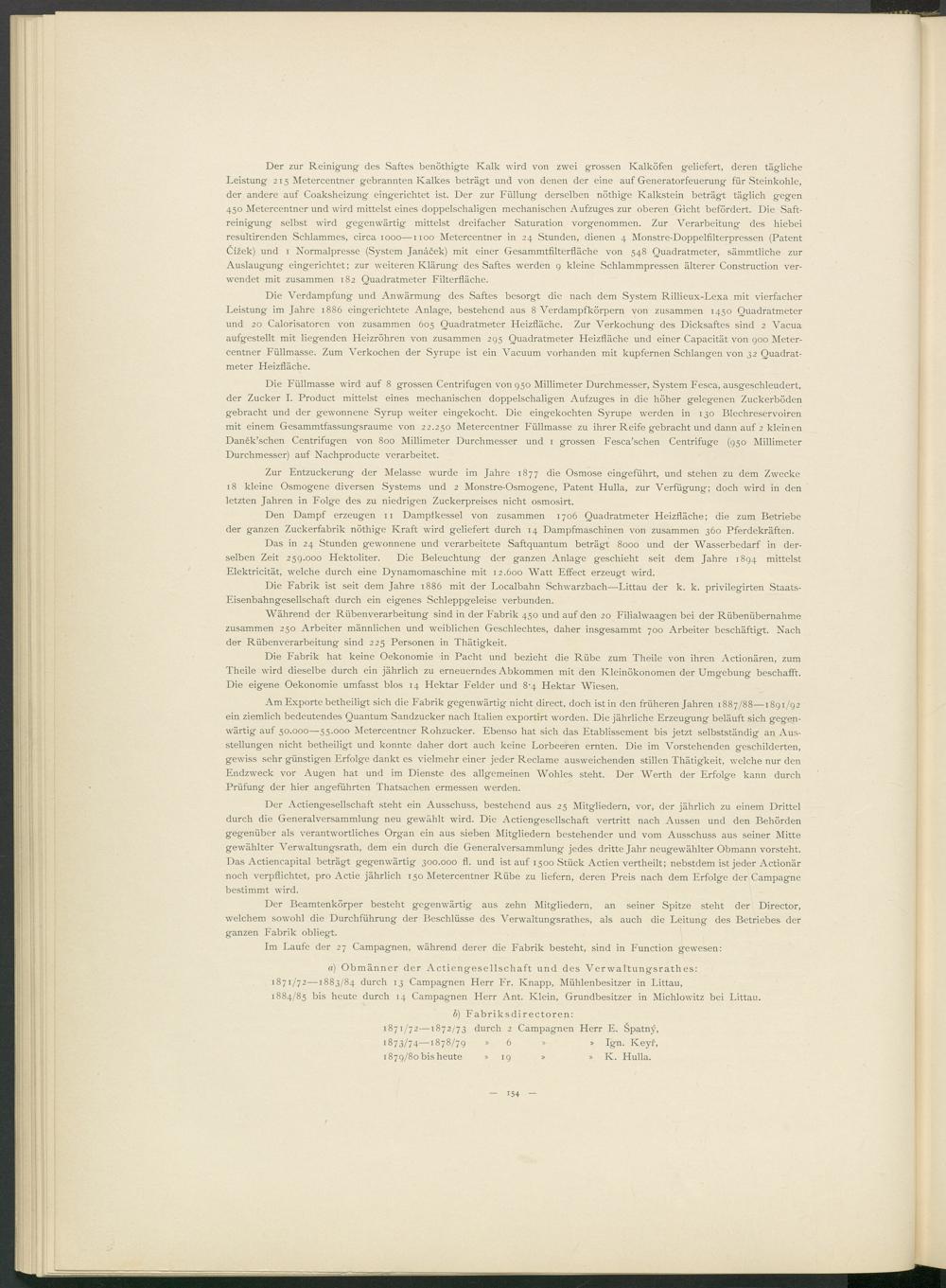 Am Exporte betheiligt sich die Fabrik gegenwärtig nicht direct, doch ist in den früheren Jahren 1887/88—1891/92 ein ziemlich bedeutendes Quantum Sandzucker nach Italien exportirt worden. Die jährliche Erzeugung beläuft sich gegenwärtig auf 50.000—55.000 Metercentner Rohzucker. Ebenso hat sich das Etablissement bis jetzt selbstständig an Ausstellungen nicht betheiligt und konnte daher dort auch keine Lorbeeren ernten. Die im Vorstehenden geschilderten, gewiss sehr günstigen Erfolge dankt es vielmehr einer jeder Reclame ausweichenden stillen Thätigkeit, welche nur den Endzweck vor Augen hat und im Dienste des allgemeinen Wohles steht. Der Werth der Erfolge kann durch Prüfung der hier angeführten Thatsachen ermessen werden.
