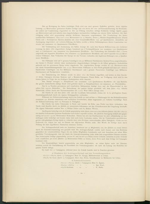Der zur Reinigung des Saftes benöthigte Kalk wird von zwei grossen Kalköfen geliefert, deren tägliche Leistung 215 Metercentner gebrannten Kalkes beträgt und von denen der eine auf Generatorfeuerung für Steinkohle, der andere auf Coaksheizung eingerichtet ist. Der zur Füllung derselben nöthige Kalkstein beträgt täglich gegen 450 Metercentner und wird mittelst eines doppelschaligen mechanischen Aufzuges zur oberen Gicht befördert. Die Saftreinigung selbst wird gegenwärtig mittelst dreifacher Saturation vorgenommen. Zur Verarbeitung des hiebei resultirenden Schlammes, circa 1000—1100 Metercentner in 24 Stunden, dienen 4 Monstre-Doppelfilterpressen (Patent Ci2ek) und 1 Normalpresse (System Janäöek) mit einer Gesammtfilterfiäche von 548 Quadratmeter, sämmtliche zur Auslaugung eingerichtet; zur weiteren Klärung des Saftes werden g kleine Schlammpressen älterer Construction verwendet mit zusammen 182 Quadratmeter Filterfläche.