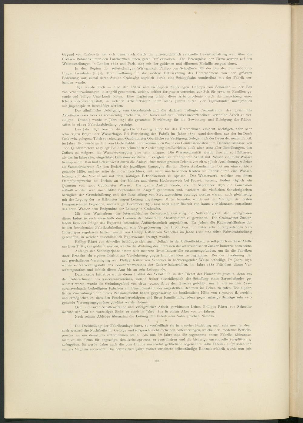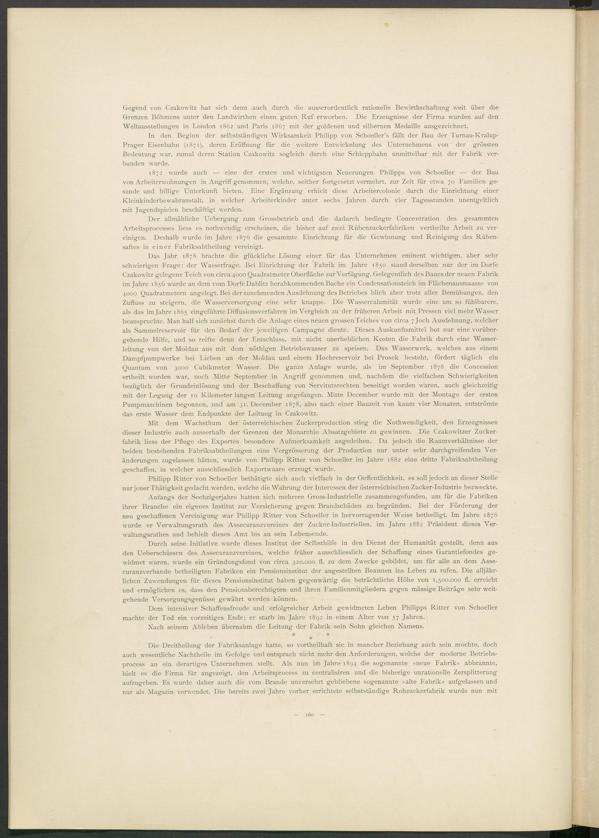 Das Jahr 1878 brachte die glückliche Lösung einer für das Unternehmen eminent wichtigen, aber sehr schwierigen Frage: der Wasserfrage. Bei Einrichtung der Fabrik im Jahre 1850 stand derselben nur der im Dorfe Czakowitz gelegene Teich von circa 4000 Quadratmeter Oberfläche zur Verfügung. Gelegentlich des Baues der neuen Fabrik im Jahre 1856 wurde an dem vom Dorfe Dablitz herabkommenden Bache ein Condensationsteich im Flächenausmaasse von 4000 Quadratmetern angelegt. Bei der zunehmenden Ausdehnung des Betriebes blieb aber trotz aller Bemühungen, den Zufluss zu steigern, die Wasserversorgung eine sehr knappe. Die Wassercalamität wurde eine um so fühlbarere, als das im Jahre 1865 eingeführte Diffusionsverfahren im Vergleich zu der früheren Arbeit mit Pressen viel mehr Wasser beanspruchte. Man half sich zunächst durch die Anlage eines neuen grossen Teiches von circa 7 Joch Ausdehnung, welcher als Sammelreservoir für den Bedarf der jeweiligen Campagne diente. Dieses Auskunftsmittel bot nur eine vorübergehende Hilfe, und so reifte denn der Entschluss, mit nicht unerheblichen Kosten die Fabrik durch eine Wasserleitung von der Moldau aus mit dem nöthigen Betriebswasser zu speisen. Das Wasserwerk, welches aus einem Dampfpumpwerke bei Lieben an der Moldau und einem Hochreservoir bei Prosek besteht, fördert täglich ein Quantum von 3000 Cubikmeter Wasser. Die ganze Anlage wurde, als im September 1878 die Concession ertheilt worden war, noch Mitte September in Angriff genommen und, nachdem die vielfachen Schwierigkeiten bezüglich der Grundeinlösung und der Beschaffung von Servitutsrechten beseitigt worden waren, auch gleichzeitig mit der Legung der 10 Kilometer langen Leitung angefangen. Mitte December wurde mit der Montage der ersten Pumpmaschinen begonnen, und am 31. December 1878, also nach einer Bauzeit von kaum vier Monaten, entströmte das erste Wasser dem Endpunkte der Leitung in Czakowitz.