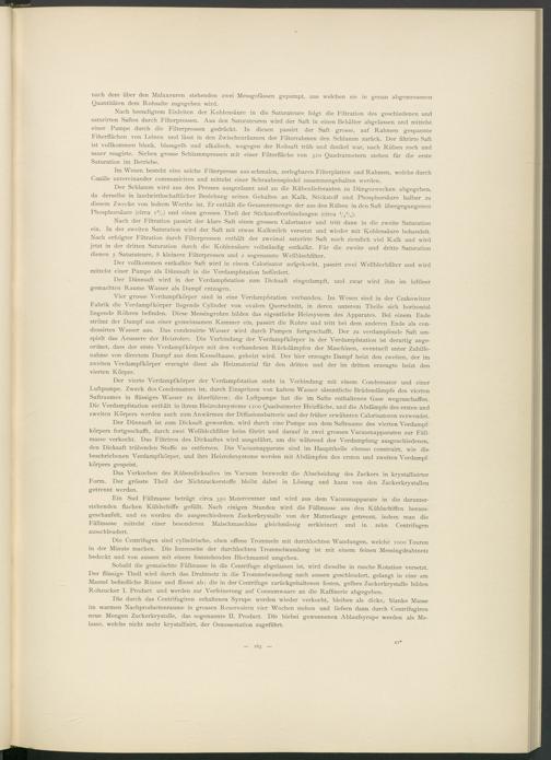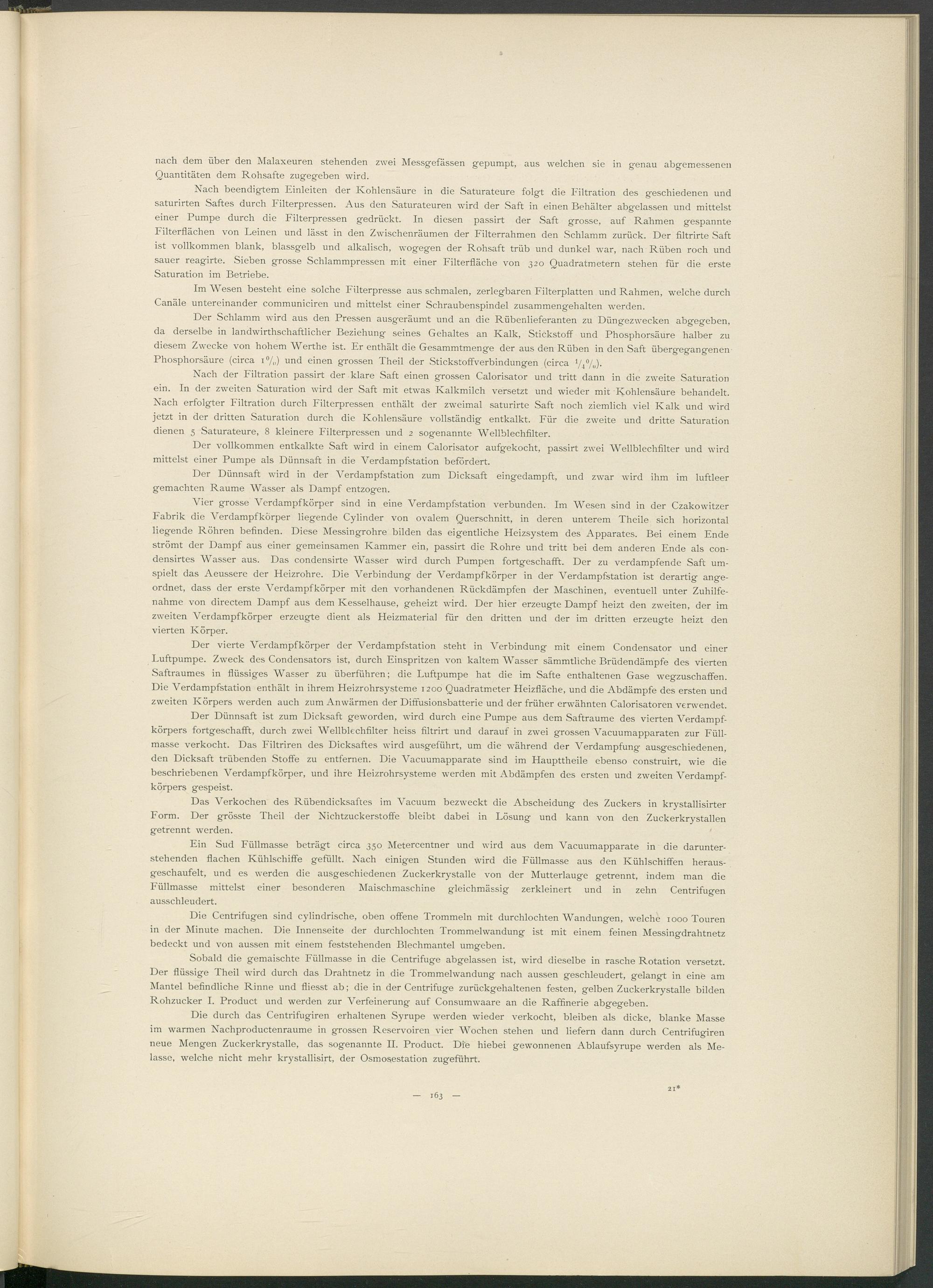 Vier grosse Verdampfkörper sind in eine Verdampfstation verbunden. Im Wesen sind in der Czakowitzer Fabrik die Verdampfkörper liegende Cylinder von ovalem Querschnitt, in deren unterem Theile sich horizontal liegende Röhren befinden. Diese Messingrohre bilden das eigentliche Heizsystem des Apparates. Bei einem Ende strömt der Dampf aus einer gemeinsamen Kammer ein, passirt die Rohre und tritt bei dem anderen Ende als con- densirtes Wasser aus. Das condensirte Wasser wird durch Pumpen fortgeschafft. Der zu verdampfende Saft umspielt das Aeussere der Heizrohre. Die Verbindung der Verdampfkörper in der Verdampfstation ist derartig angeordnet, dass der erste Verdampfkörper mit den vorhandenen Rückdämpfen der Maschinen, eventuell unter Zuhilfenahme von directem Dampf aus dem Kesselhause, geheizt wird. Der hier erzeugte Dampf heizt den zweiten, der im zweiten Verdampfkörper erzeugte dient als Heizmaterial für den dritten und der im dritten erzeugte heizt den vierten Körper.