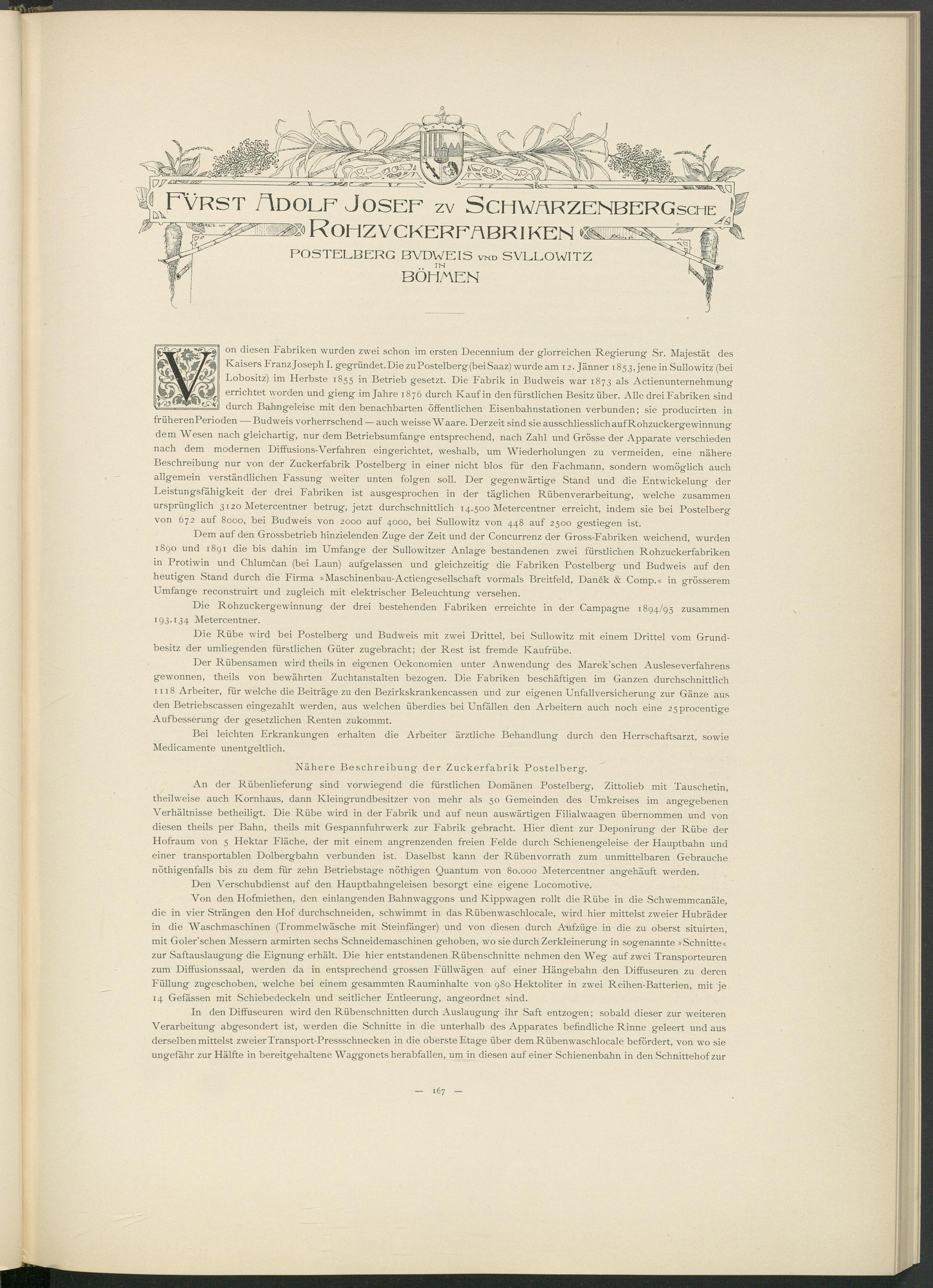 on diesen Fabriken wurden zwei schon im ersten Decennium der glorreichen Regierung Sr. Majestät des Kaisers Franz Joseph I. gegründet.Die zuPostelberg(beiSaaz) wurde am 12. Jänner 1853, jene in Sullowitz (bei Lobositz) im Herbste 1855 E Betrieb gesetzt. Die Fabrik in Budweis war 1873 als Actienunternehmung errichtet worden und gieng im Jahre 1876 durch Kauf in den fürstlichen Besitz über. Alle drei Fabriken sind durch Bahngeleise mit den benachbarten öffentlichen Eisenbahnstationen verbunden; sie producirten in früherenPerioden — Budweis vorherrschend — auch weisse Waare. Derzeit sind sie ausschliesslichaufRohzuckergewinnung dem Wesen nach gleichartig, nur dem Betriebsumfange entsprechend, nach Zahl und Grösse der Apparate verschieden nach dem modernen Diffusions-Verfahren eingerichtet, weshalb, um Wiederholungen zu vermeiden, eine nähere Beschreibung nur von der Zuckerfabrik Posteiberg in einer nicht blos für den Fachmann, sondern womöglich auch allgemein verständlichen Fassung weiter unten folgen soll. Der gegenwärtige Stand und die Entwickelung der Leistungsfähigkeit der drei Fabriken ist ausgesprochen in der täglichen Rübenverarbeitung, welche zusammen ursprünglich 3120 Metercentner betrug, jetzt durchschnittlich 14.500 Metercentner erreicht, indem sie bei Posteiberg von 672 auf 8000, bei Budweis von 2000 auf 4000, bei Sullowitz von 448 auf 2500 gestiegen ist.