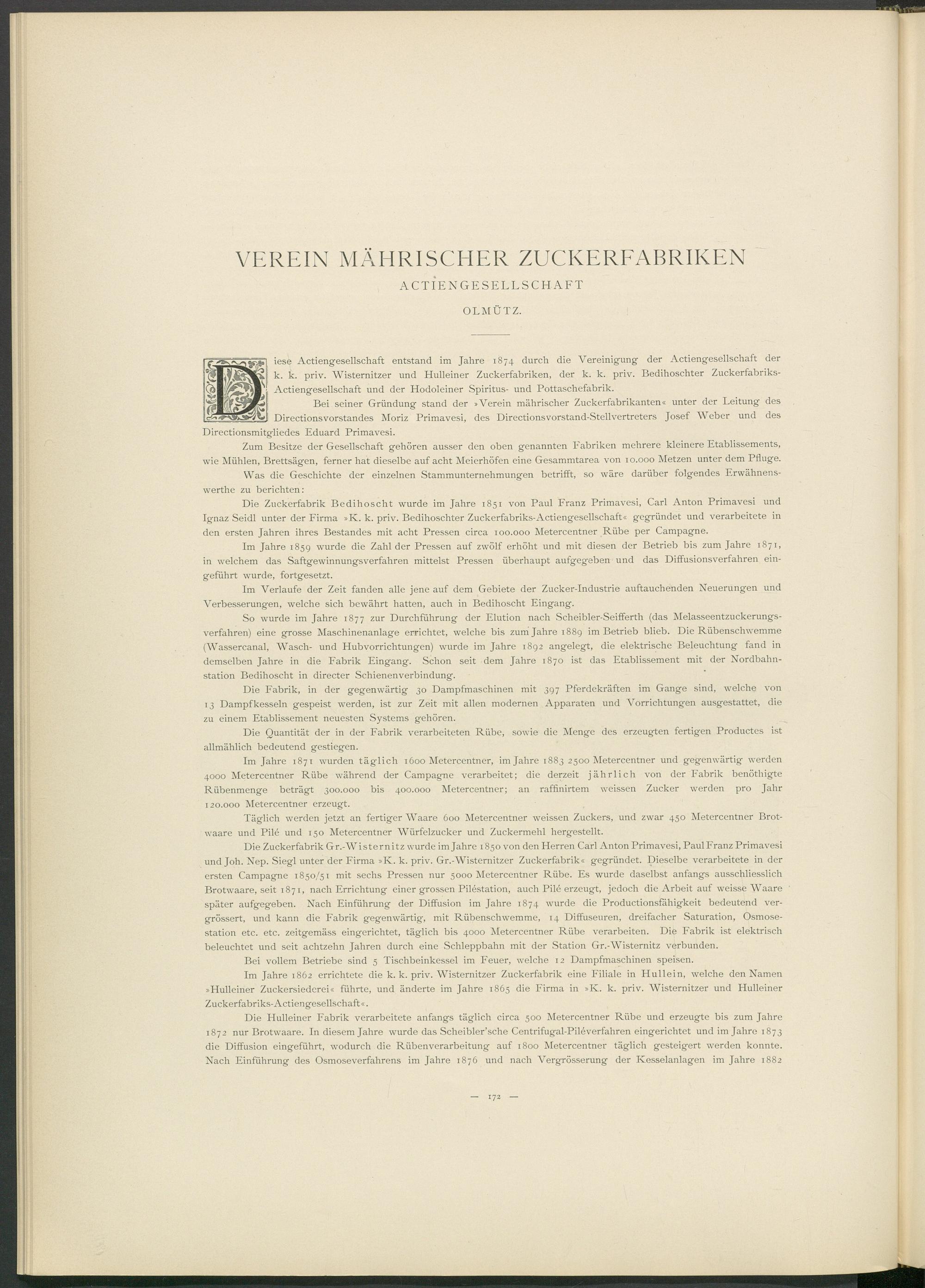 iese Actiengesellschaft entstand im Jahre 1874 durch die Vereinigung der Actiengesellschaft der k. k. priv. Wisternitzer und Hulleiner Zuckerfabriken, der k. k. priv. Bedihoschter Zuckerfabriks- Actiengesellschaft und der Hodoleiner Spiritus- und Pottaschefabrik.