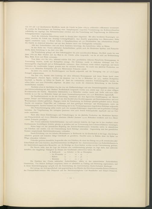 Ueberdies gehören sämmtliche Angestellte aller vier Fabriken, die einen den Betrag von 400 fl. erreichenden jährlichen Gehalt oder Lohn beziehen, dem Pensionsinstitute der Mitglieder des »Assecuranzvereines von Zuckerfabrikanten in der österreichisch-ungarischen Monarchie« an; die Beiträge an dieses Institut werden von der Unternehmung geleistet.