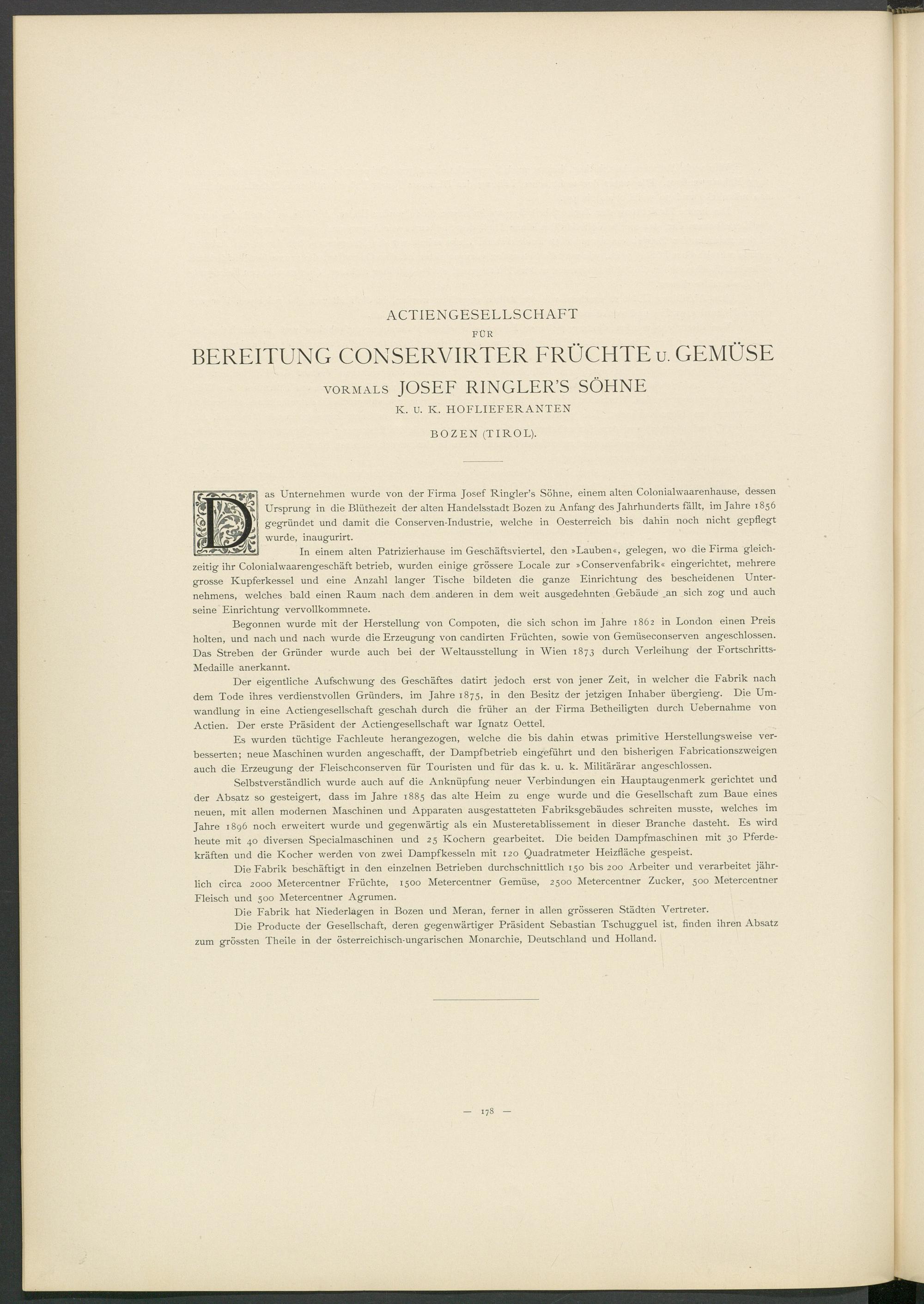 as Unternehmen wurde von der Firma Josef Ringler’s Söhne, einem alten Colonialwaarenhause, dessen Ursprung in die Blüthezeit der alten Handelsstadt Bozen zu Anfang des Jahrhunderts fällt, im Jahre 1856 gegründet und damit die Conserven-Industrie, welche in Oesterreich bis dahin noch nicht gepflegt wurde, inaugurirt.