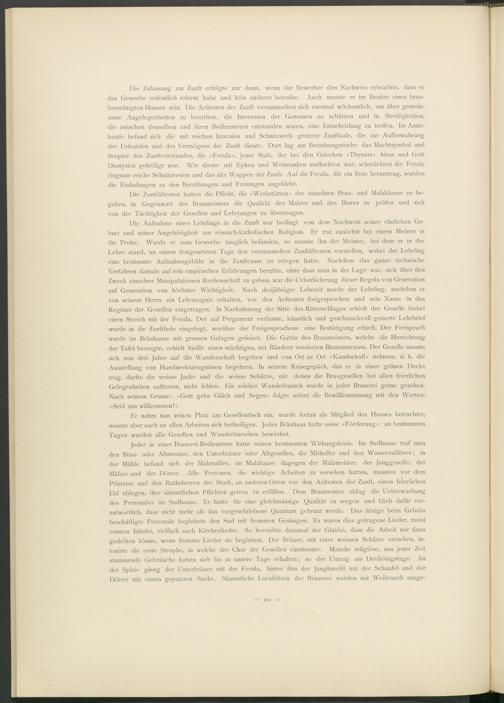 Die Aufnahme eines Lehrlings in die Zunft war bedingt von dem Nachweis seiner ehelichen Geburt und seiner Angehörigkeit zur römisch-katholischen Religion. Er trat zunächst bei einem Meister in die Probe. Wurde er zum Gewerbe tauglich befunden, so musste ihn der Meister, bei dem er in der Lehre stand, an einem festgesetzten Tage den versammelten Zunftältesten vorstellen, wobei der Lehrling eine bestimmte Aufnahmsgebühr in die Zunftcasse zu erlegen hatte. Nachdem das ganze technische Verfahren damals auf rein empirischen Erfahrungen beruhte, ohne dass man in der Lage war, sich über den Zweck einzelner Manipulationen Rechenschaft zu geben, war die Ueberlieferung dieser Regeln von Generation auf Generation von höchster Wichtigkeit. Nach dreijähriger Lehrzeit wurde der Lehrling, nachdem er von seinem Herrn ein Lehrzeugnis erhalten, vor den Aeltesten freigesprochen und sein Name in das Register der Gesellen eingetragen. In Nachahmung der Sitte des Ritterschlages erhielt der Geselle hiebei einen Streich mit der Ferula. Der auf Pergament verfasste, künstlich und geschmackvoll gezierte Lehrbrief wurde in die Zunftlade eingelegt, worüber der Freigesprochene eine Bestätigung erhielt. Der Freispruch wurde im Bräuhause mit grossen Gelagen gefeiert. Die Gattin des Braumeisters, welche die Herrichtung der Tafel besorgte, erhielt hiefür einen mächtigen, mit Bändern verzierten Blumenstrauss. Der Geselle musste sich nun drei Jahre auf die Wanderschaft begeben und von Ort zu Ort »Kundschaft« nehmen, d. h. die Ausstellung von Handwerkszeugnissen begehren. In seinem Reisegepäck, das er in einer grünen Decke trug, durfte die weisse Jacke und die weisse Schürze, mit denen die Braugesellen bei allen feierlichen Gelegenheiten auftraten, nicht fehlen. Ein solcher Wanderbursch wurde in jeder Brauerei gerne gesehen. Nach seinem Grusse: »Gott gebe Glück und Segen« folgte sofort die Bewillkommnung mit den Worten: »Seid uns willkommen!«