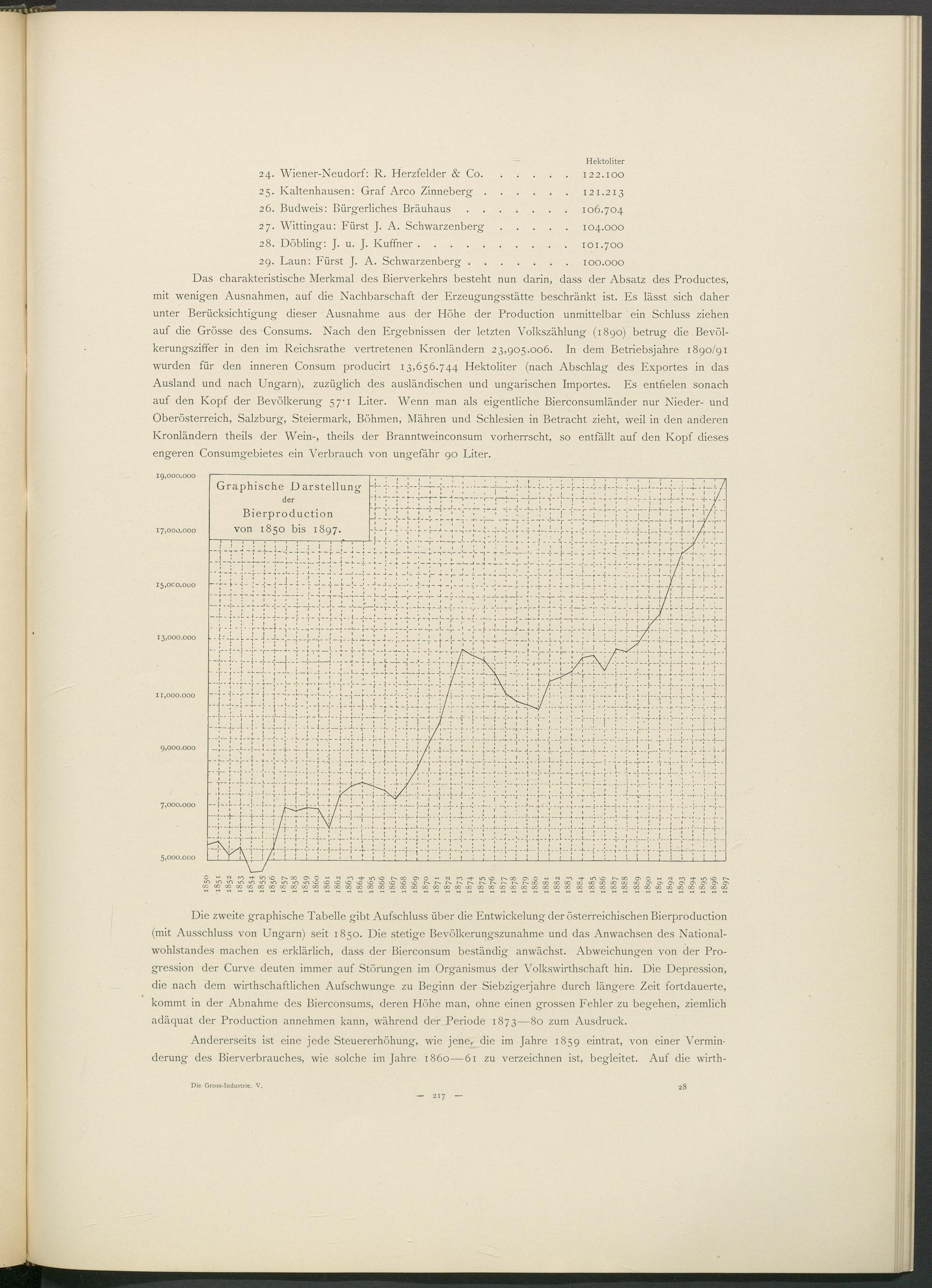 Das charakteristische Merkmal des Bierverkehrs besteht nun darin, dass der Absatz des Productes, mit wenigen Ausnahmen, auf die Nachbarschaft der Erzeugungsstätte beschränkt ist. Es lässt sich daher unter Berücksichtigung dieser Ausnahme aus der Höhe der Production unmittelbar ein Schluss ziehen auf die Grösse des Consums. Nach den Ergebnissen der letzten Volkszählung (1890) betrug die Bevölkerungsziffer in den im Reichsrathe vertretenen Kronländern 23,905.006. In dem Betriebsjahre 1890/91 wurden für den inneren Consum producirt 13,656.744 Hektoliter (nach Abschlag des Exportes in das Ausland und nach Ungarn), zuzüglich des ausländischen und ungarischen Importes. Es entfielen sonach auf den Kopf der Bevölkerung 57-1 Liter. Wenn man als eigentliche Bierconsumländer nur Nieder- und Oberösterreich, Salzburg, Steiermark, Böhmen, Mähren und Schlesien in Betracht zieht, weil in den anderen Kronländern theils der Wein-, theils der Branntweinconsum vorherrscht, so entfällt auf den Kopf dieses engeren Consumgebietes ein Verbrauch von ungefähr 90 Liter.