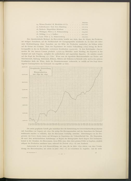 Die zweite graphische Tabelle gibt Aufschluss über die Entwickelung der österreichischen Bierproduction (mit Ausschluss von Ungarn) seit 1850. Die stetige Bevölkerung-szunahme und das Anwachsen des Nationalwohlstandes machen es erklärlich, dass der Bierconsum beständig anwächst. Abweichungen von der Progression der Curve deuten immer auf Störungen im Organismus der \ 7 olkswirthschaft hin. Die Depression, die nach dem wirtschaftlichen Aufschwünge zu Beginn der Siebzigerjahre durch längere Zeit fortdauerte,
