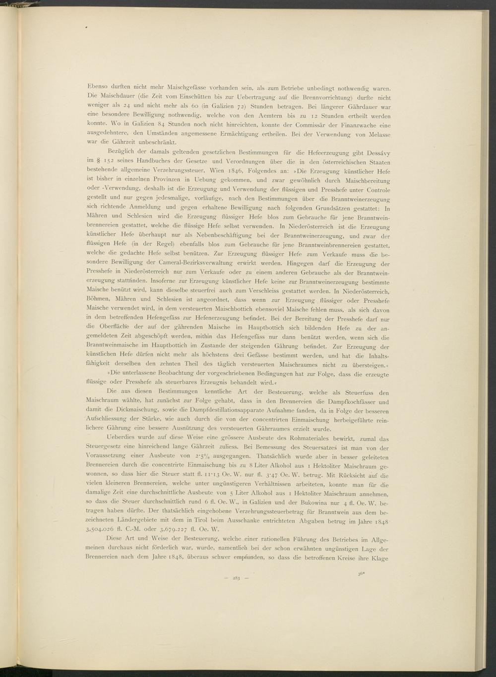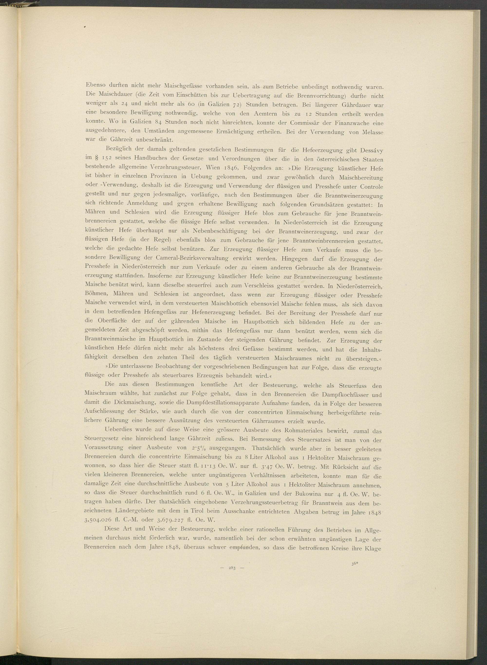 Ueberdies wurde auf diese Weise eine grössere Ausbeute des Rohmateriales bewirkt, zumal das Steuergesetz eine hinreichend lange Gährzeit zuliess. Bei Bemessung des Steuersatzes ist man von der Voraussetzung einer Ausbeute von 2-5% ausgegangen. Thatsächlich wurde aber in besser geleiteten Brennereien durch die concentrirte Einmaischung bis zu 8 Liter Alkohol aus 1 Hektoliter Maischraum gewonnen, so dass hier die Steuer statt fl. 11-13 Oe. W. nur fl. 3-47 Oe. W. betrug. Mit Rücksicht auf die vielen kleineren Brennereien, welche unter ungünstigeren Verhältnissen arbeiteten, konnte man für die damalige Zeit eine durchschnittliche Ausbeute von 5 Liter Alkohol aus 1 Hektoliter Maischraum annehmen, so dass die Steuer durchschnittlich rund 6 fl. Oe. W., in Galizien und der Bukowina nur 4 fl. Oe. W. betragen haben dürfte. Der thatsächlich eingehobene Verzehrungssteuerbetrag für Branntwein aus dem be- zeichneten Ländergebiete mit dem in Tirol beim Ausschanke entrichteten Abgaben betrug im Jahre 1848 3,504.026 fl. C.-M. oder 3,679.227 fl. Oe. W.