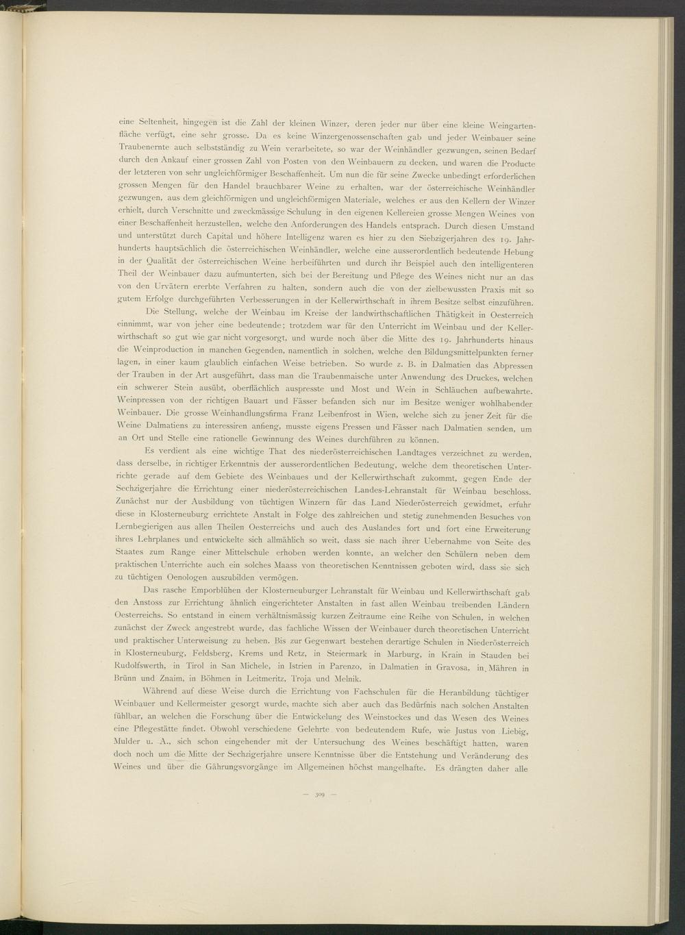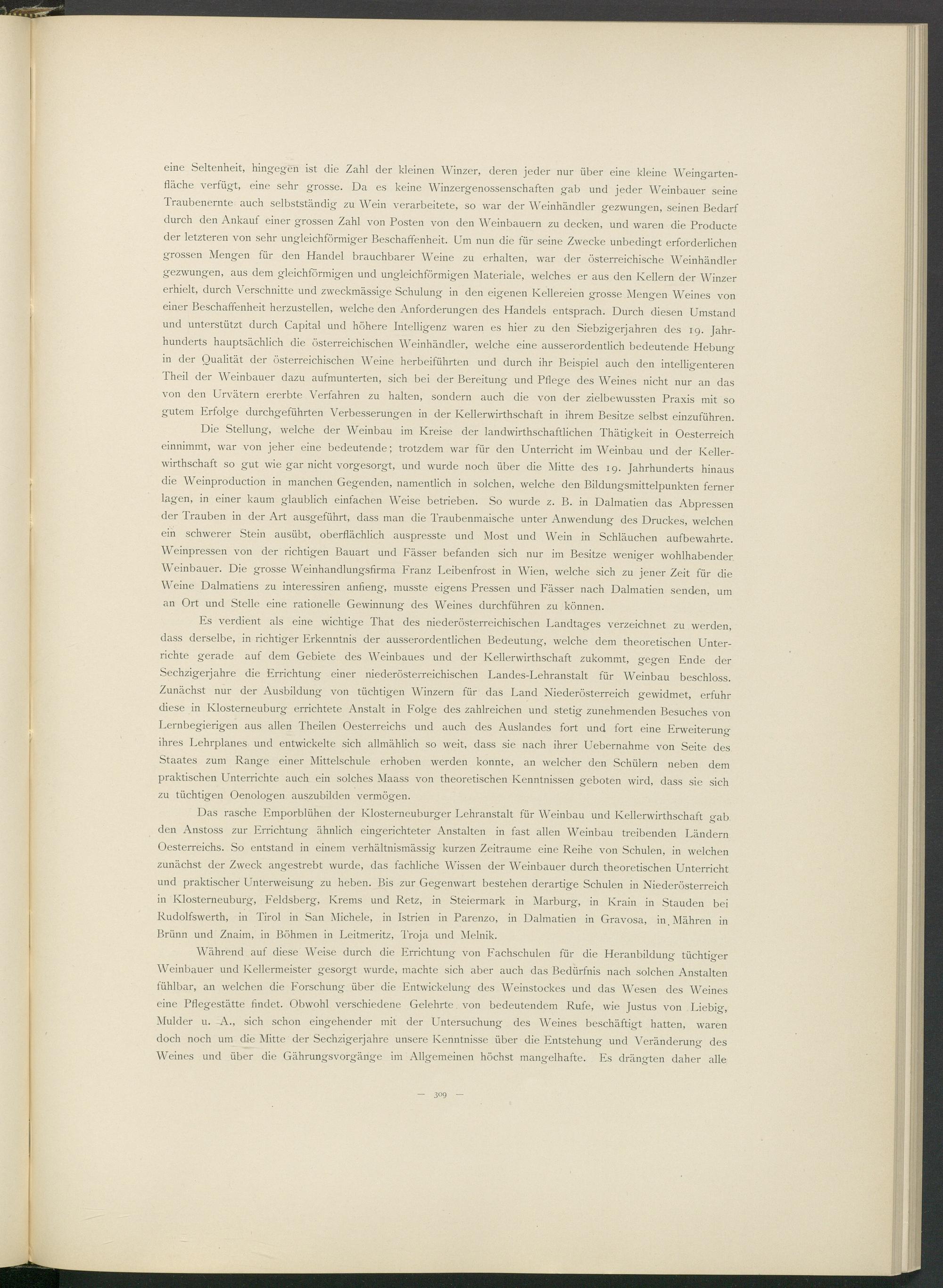 Es verdient als eine wichtige That des niederösterreichischen Landtages verzeichnet zu werden, dass derselbe, in richtiger Erkenntnis der ausserordentlichen Bedeutung, welche dem theoretischen Unterrichte gerade auf dem Gebiete des Weinbaues und der Kellerwirthschaft zukommt, gegen Ende der Sechzigerjahre die Errichtung einer niederösterreichischen Landes-Lehranstalt für Weinbau beschloss. Zunächst nur der Ausbildung von tüchtigen Winzern für das Land Niederösterreich gewidmet, erfuhr diese in Klosterneuburg errichtete Anstalt in Folge des zahlreichen und stetig zunehmenden Besuches von Lernbegierigen aus allen Theilen Oesterreichs und auch des Auslandes fort und fort eine Erweiterung ihres Lehrplanes und entwickelte sich allmählich so weit, dass sie nach ihrer Uebernahme von Seite des Staates zum Range einer Mittelschule erhoben werden konnte, an welcher den Schülern neben dem praktischen Unterrichte auch ein solches Maass von theoretischen Kenntnissen geboten wird, dass sie sich zu tüchtigen Oenologen auszubilden vermögen.