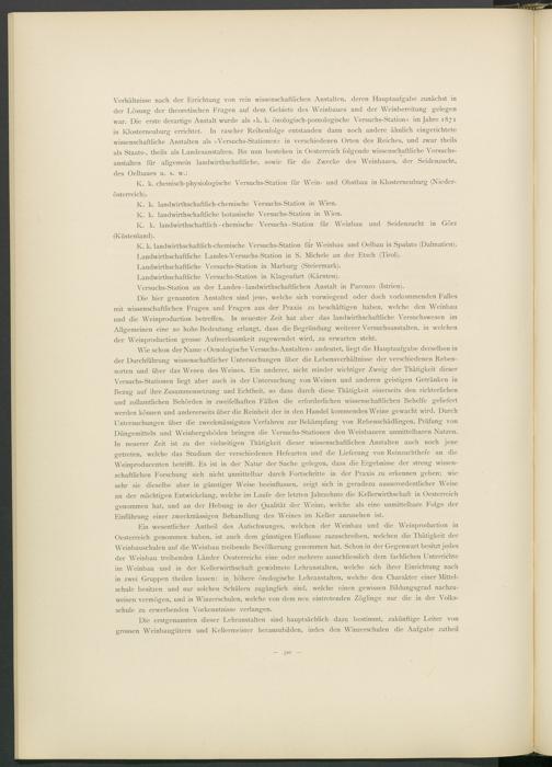 Die hier genannten Anstalten sind jene, welche sich vorwiegend oder doch vorkommenden Falles mit wissenschaftlichen Fragen und Fragen aus der Praxis zu beschäftigen haben, welche den Weinbau und die Weinproduction betreffen. In neuester Zeit hat aber das landwirthschaftliche Versuchswesen im Allgemeinen eine so hohe Bedeutung erlangt, dass die Begründung weiterer Versuchsanstalten, in welchen der Weinproduction grosse Aufmerksamkeit zugewendet wird, zu erwarten steht.