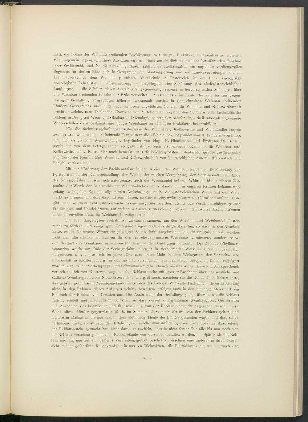 Für die fachwissenschaftlichen Bedürfnisse der Weinbauer, Kellerwirthe und Weinhändler sorgen zwei grosse, wöchentlich erscheinende Fachblätter: die »Weinlaube«, begründet von A. Freiherrn von Babo, und die »Allgemeine Wein-Zeitung«, begründet von Hugo H. Hitschmann und Professor Dr. Bersch, sowie der von dem Letztgenannten redigirte, als Jahrbuch erscheinende »Kalender für Weinbau und Kellerwirthschaft«. Es sei hier auch bemerkt, dass die beiden grössten in deutscher Sprache geschriebenen Fachwerke der Neuzeit über Weinbau und Kellerwirthschaft von österreichischen Autoren (Babo-Mach und Bersch) verfasst sind.