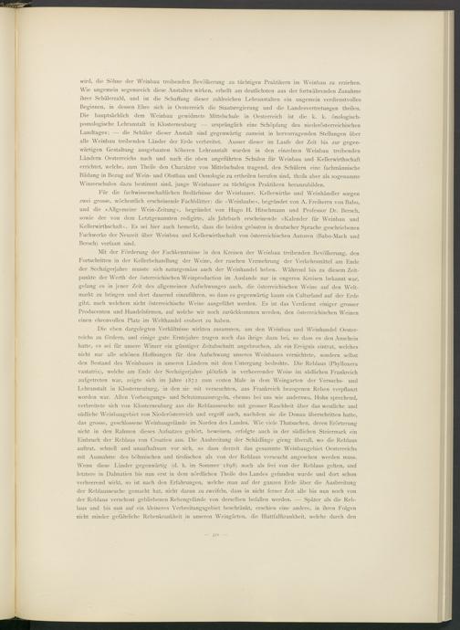 wird, die Söhne der Weinbau treibenden Bevölkerung- zu tüchtigen Praktikern im Weinbau zu erziehen. Wie ungemein segensreich diese Anstalten wirken, erhellt am deutlichsten aus der fortwährenden Zunahme ihrer Schülerzahl, und ist die Schaffung dieser zahlreichen Lehranstalten ein ungemein verdienstvolles Beginnen, in dessen Ehre sich in Oesterreich die Staatsregierung und die Landesvertretungen theilen. Die hauptsächlich dem W r einbau gewidmete Mittelschule in Oesterreich ist die k. k. önologisch- pomologische Lehranstalt in Klosterneuburg — ursprünglich eine Schöpfung des niederösterreichischen Landtages; — die Schüler dieser Anstalt sind gegenwärtig zumeist in hervorragenden Stellungen über alle Weinbau treibenden Länder der Erde verbreitet. Ausser dieser im Laufe der Zeit bis zur gegenwärtigen Gestaltung ausgebauten höheren Lehranstalt wurden in den einzelnen Weinbau treibenden Ländern Oesterreichs nach und nach die oben angeführten Schulen für Weinbau und Kellerwirthschaft errichtet, welche, zum Theile den Charakter von Mittelschulen tragend, den Schülern eine fachmännische Bildung in Bezug auf Wein- und Obstbau und Oenologie zu ertheilen berufen sind, theils aber als sogenannte Winzerschulen dazu bestimmt sind, junge Weinbauer zu tüchtigen Praktikern heranzubilden.