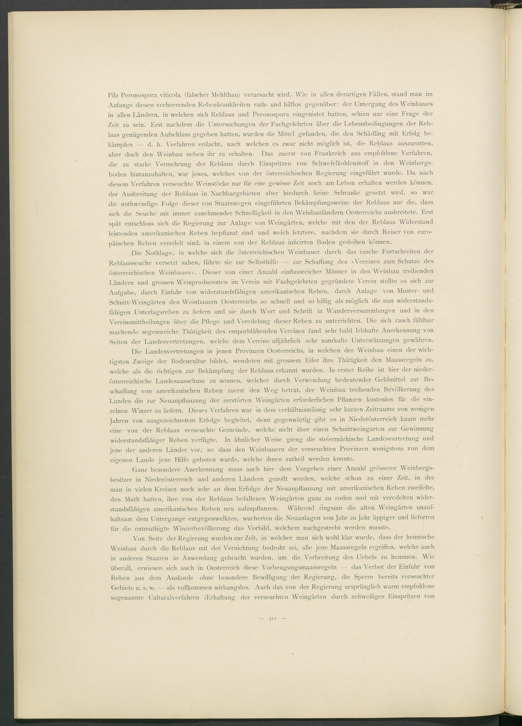 Pilz Peronospora viticola (falscher Mehlthau) verursacht wird. Wie in allen derartigen Fällen, stand man im Anfänge diesen verheerenden Rebenkrankheiten rath- und hilflos gegenüber: der Untergang des Weinbaues in allen Ländern, in welchen sich Reblaus und Peronospora eingenistet hatten, schien nur eine Frage der Zeit zu sein. Erst nachdem die Untersuchungen der Fachgelehrten über die Lebensbedingungen der Reblaus genügenden Aufschluss gegeben hatten, wurden die Mittel gefunden, die den Schädling mit Erfolg bekämpfen — d. h. Verfahren erdacht, nach welchen es zwar nicht möglich ist, die Reblaus auszurotten, aber doch den Weinbau neben ihr zu erhalten. Das zuerst von Frankreich aus empfohlene Verfahren, die zu starke Vermehrung der Reblaus durch Einspritzen von Schwefelkohlenstoff in den Weinbergsboden hintanzuhalten, war jenes, welches von der österreichischen Regierung eingeführt wurde. Da nach diesem Verfahren verseuchte Weinstöcke nur für eine gewisse Zeit noch am Leben erhalten werden können, der Ausbreitung der Reblaus in Nachbargebieten aber hiedurch keine Schranke gesetzt wird, so war die nothwendige Folge dieser von Staatswegen eingeführten Bekämpfungsweise der Reblaus nur die, dass sich die Seuche mit immer zunehmender Schnelligkeit in den Weinbauländern Oesterreichs ausbreitete. Erst spät entschloss sich die Regierung zur Anlage von Weingärten, welche mit den der Reblaus Widerstand leistenden amerikanischen Reben bepflanzt sind und welch letztere, nachdem sie durch Reiser von europäischen Reben veredelt sind, in einem von der Reblaus inficirten Boden gedeihen können.