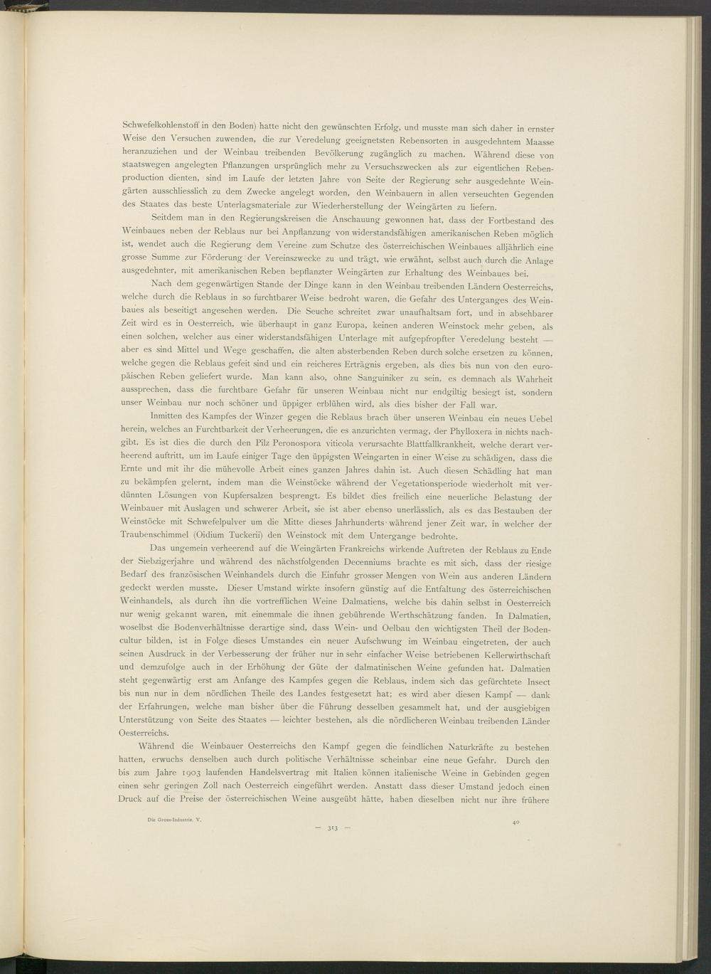 Nach dem gegenwärtigen Stande der Dinge kann in den Weinbau treibenden Ländern Oesterreichs, welche durch die Reblaus in so furchtbarer Weise bedroht waren, die Gefahr des Unterganges des Weinbaues als beseitigt angesehen werden. Die Seuche schreitet zwar unaufhaltsam fort, und in absehbarer Zeit wird es in Oesterreich, wie überhaupt in ganz Europa, keinen anderen Weinstock mehr geben, als einen solchen, welcher aus einer widerstandsfähigen Unterlage mit aufgepfropfter Veredelung besteht — aber es sind Mittel und Wege geschaffen, die alten absterbenden Reben durch solche ersetzen zu können, welche gegen die Reblaus gefeit sind und ein reicheres Erträgnis ergeben, als dies bis nun von den europäischen Reben geliefert wurde. Man kann also, ohne Sanguiniker zu sein, es demnach als Wahrheit aussprechen, dass die furchtbare Gefahr für unseren Weinbau nicht nur endgiltig besiegt ist, sondern unser Weinbau nur noch schöner und üppiger erblühen wird, als dies bisher der Fall war.