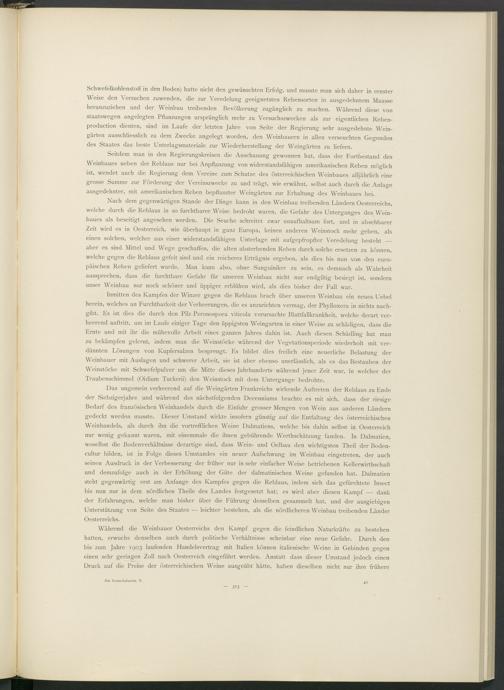 Seitdem man in den Regierungskreisen die Anschauung gewonnen hat, dass der Fortbestand des Weinbaues neben der Reblaus nur bei Anpflanzung von widerstandsfähigen amerikanischen Reben möglich ist, wendet auch die Regierung dem Vereine zum Schutze des österreichischen Weinbaues alljährlich eine grosse Summe zur Förderung der Vereinszwecke zu und trägt, wie erwähnt, selbst auch durch die Anlage ausgedehnter, mit amerikanischen Reben bepflanzter Weingärten zur Erhaltung des Weinbaues bei.