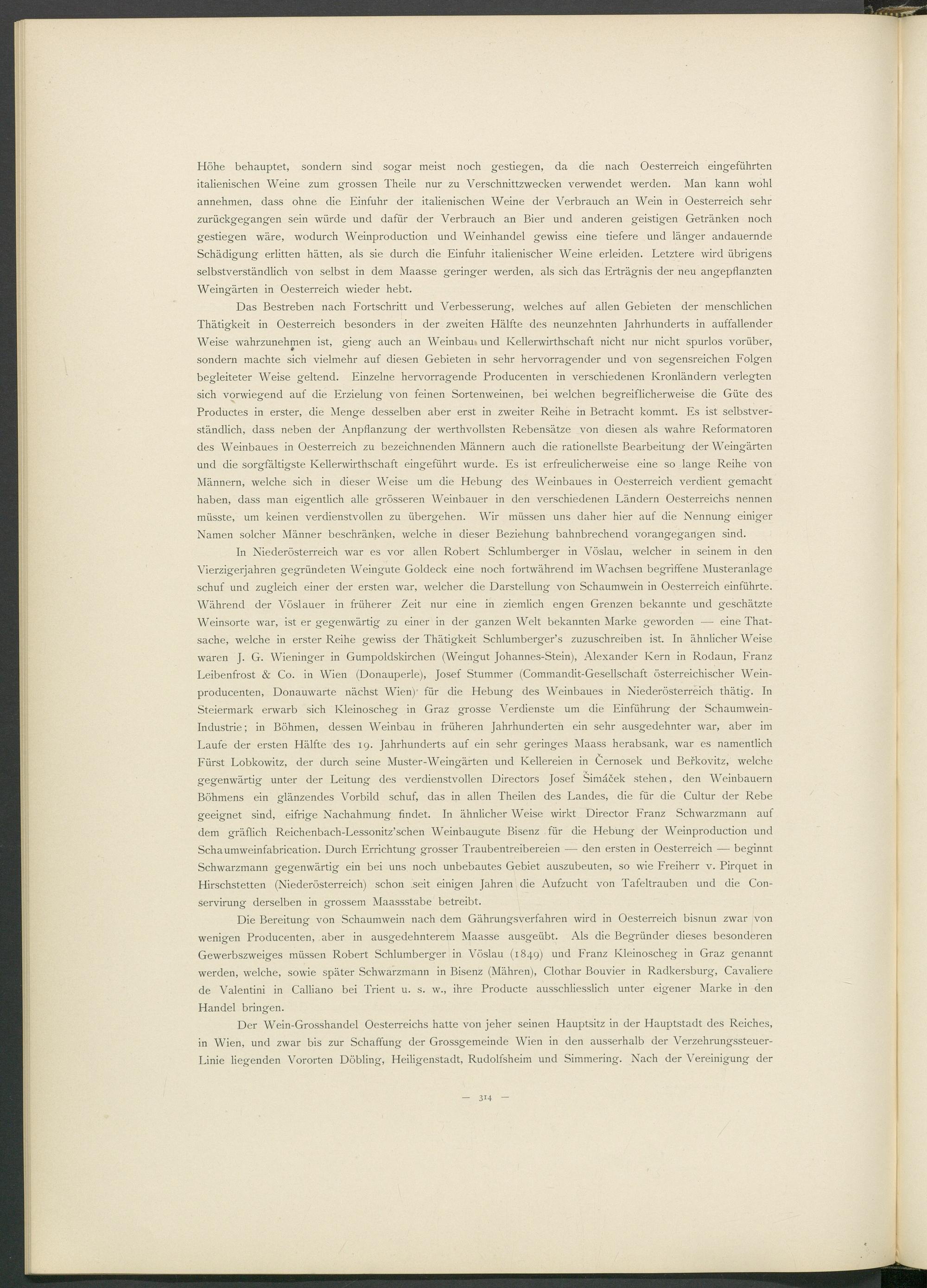 In Niederösterreich war es vor allen Robert Schlumberger in Vöslau, welcher in seinem in den Vierzigerjahren gegründeten Weingute Goldeck eine noch fortwährend im Wachsen begriffene Musteranlage schuf und zugleich einer der ersten war, welcher die Darstellung von Schaumwein in Oesterreich einführte. Während der Vöslauer in früherer Zeit nur eine in ziemlich engen Grenzen bekannte und geschätzte Weinsorte war, ist er gegenwärtig zu einer in der ganzen Welt bekannten Marke geworden — eine That- sache, welche in erster Reihe gewiss der Thätigkeit Schlumberger’s zuzuschreiben ist. In ähnlicher Weise waren J. G. Wieninger in Gumpoldskirchen (Weingut Johannes-Stein), Alexander Kern in Rodaun, Franz Leibenfrost & Co. in Wien (Donauperle), Josef Stummer (Commandit-Gesellschaft österreichischer Weinproducenten, Donauwarte nächst Wien) für die Hebung des Weinbaues in Niederösterreich thätig. In Steiermark erwarb sich Ivleinoscheg in Graz grosse Verdienste um die Einführung der Schaumwein- Industrie; in Böhmen, dessen Weinbau in früheren Jahrhunderten ein sehr ausgedehnter war, aber im Laufe der ersten Hälfte des 19. Jahrhunderts auf ein sehr geringes Maass herabsank, war es namentlich Fürst Lobkowitz, der durch seine Muster-Weingärten und Kellereien in Cernosek und Berkovitz, welche gegenwärtig unter der Leitung des verdienstvollen Directors Josef Simäcek stehen, den Weinbauern Böhmens ein glänzendes Vorbild schuf, das in allen Theilen des Landes, die für die Cultur der Rebe geeignet sind, eifrige Nachahmung findet. In ähnlicher Weise wirkt Director Franz Schwarzmann auf dem gräflich Reichenbach-Lessonitz’schen Weinbaugute Bisenz für die Hebung der Weinproduction und Schaumweinfabrication. Durch Errichtung grosser Traubentreibereien — den ersten in Oesterreich — beginnt Schwarzmann gegenwärtig ein bei uns noch unbebautes Gebiet auszubeuten, so wie Freiherr v. Pirquet in Hirschstetten (Niederösterreich) schon .seit einigen Jahren die Aufzucht von Tafeltrauben und die Con- servirung derselben in grossem Maassstabe betreibt.