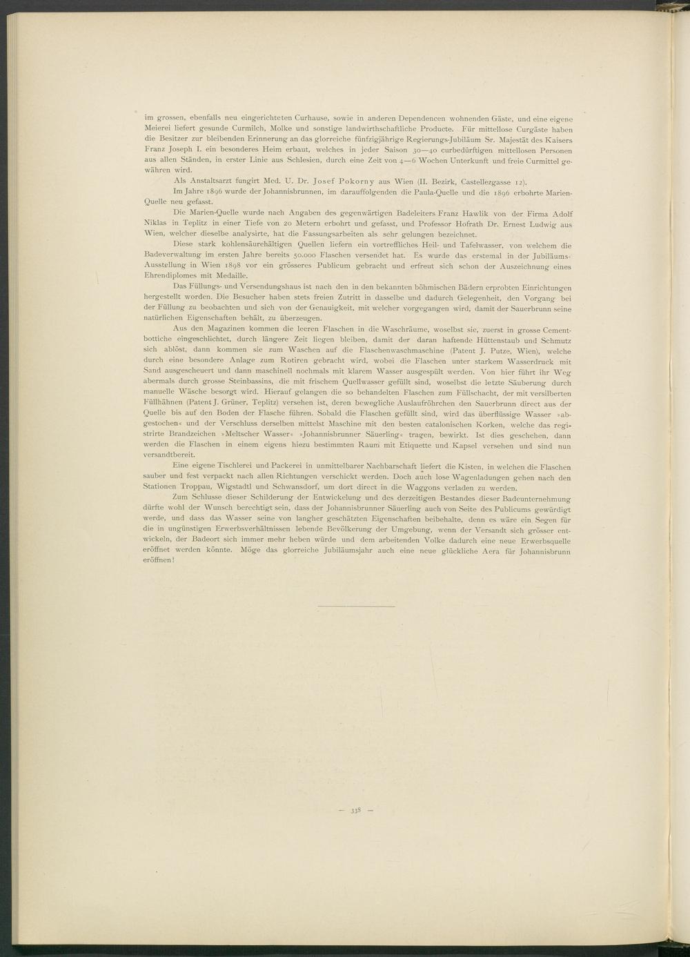 Zum Schlüsse dieser Schilderung der Entwickelung und des derzeitigen Bestandes dieser Badeunternehmung dürfte wohl der Wunsch berechtigt sein, dass der Johannisbrunner Säuerling auch von Seite des Publicums gewürdigt werde, und dass das Wasser seine von langher geschätzten Eigenschaften beibehalte, denn es wäre ein Segen für die in ungünstigen Erwerbsverhältnissen lebende Bevölkerung der Umgebung, wenn der Versandt sich grösser entwickeln, der Badeort sich immer mehr heben würde und dem arbeitenden Volke dadurch eine neue Erwerbsquelle eröffnet werden könnte. Möge das glorreiche Jubiläumsjahr auch eine neue glückliche Aera für Johannisbrunn eröffnen!
