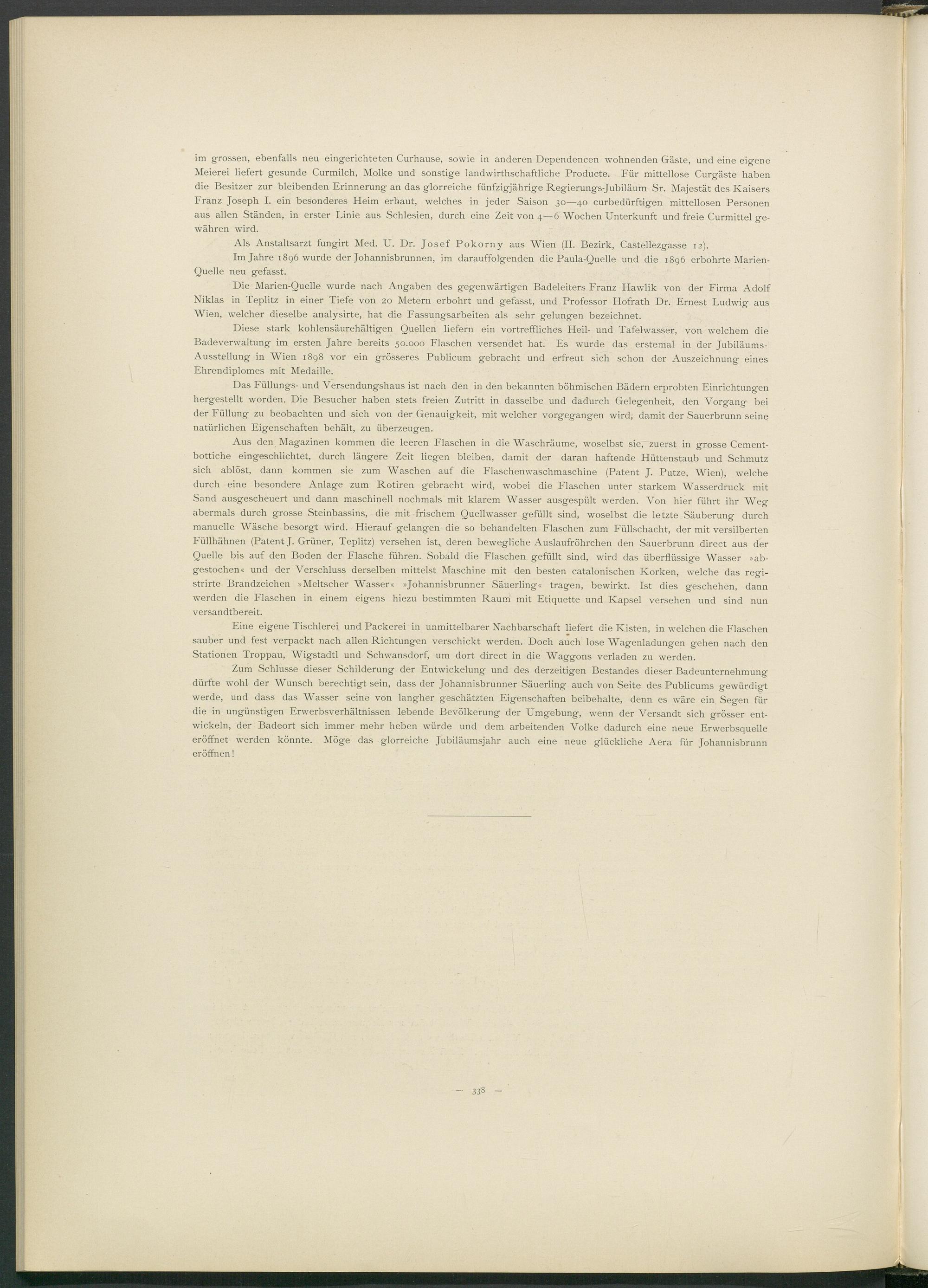 Aus den Magazinen kommen die leeren Flaschen in die Waschräume, woselbst sie, zuerst in grosse Cement- bottiche eingeschlichtet, durch längere Zeit liegen bleiben, damit der daran haftende Hüttenstaub und Schmutz sich ablöst, dann kommen sie zum Waschen auf die Flaschen Waschmaschine (Patent J. Putze, Wien), welche durch eine besondere Anlage zum Rotiren gebracht wird, wobei die Flaschen unter starkem Wasserdruck mit Sand ausgescheuert und dann maschinell nochmals mit klarem Wasser ausgespült werden. Von hier führt ihr Weg abermals durch grosse Steinbassins, die mit frischem Quellwasser gefüllt sind, woselbst die letzte Säuberung durch manuelle Wäsche besorgt wird. Hierauf gelangen die so behandelten Flaschen zum Füllschacht, der mit versilberten Füllhähnen (Patent J. Grüner, Teplitz) versehen ist* deren bewegliche Auslaufröhrchen den Sauerbrunn direct aus der Quelle bis auf den Boden der Flasche führen. Sobald die Flaschen gefüllt sind, wird das überflüssige Wasser »abgestochen« und der Verschluss derselben mittelst Maschine mit den besten catalonischen Korken, welche das regi- strirte Brandzeichen »Meltscher Wasser« »Johannisbrunner Säuerling« tragen, bewirkt. Ist dies geschehen, dann werden die Flaschen in einem eigens hiezu bestimmten Raum mit Etiquette und Kapsel versehen und sind nun versandtbereit.
